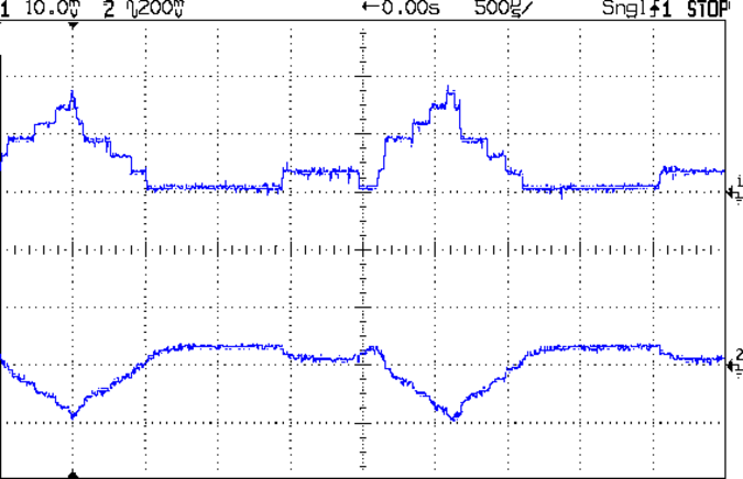 The bottom trace shows the effect of those peaks in the top trace (at 200 mA/div) on the Arduino’s VCC pin: