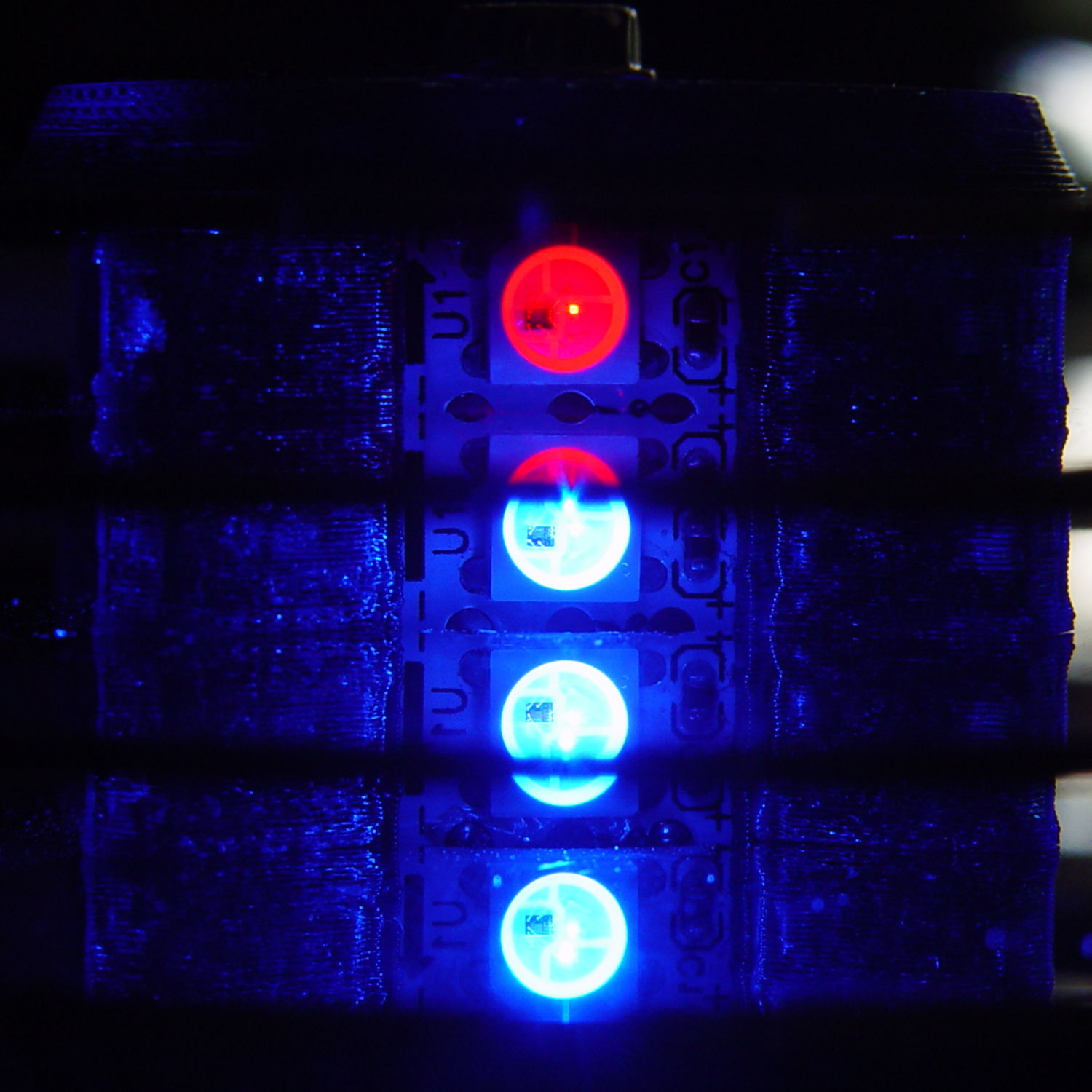 The temperature is 50 °C with the LEDs running at maximum PWM = 128. Reducing the maximum PWM to 64 reduces the core to 30 °C and that dead blue LED springs back to life.