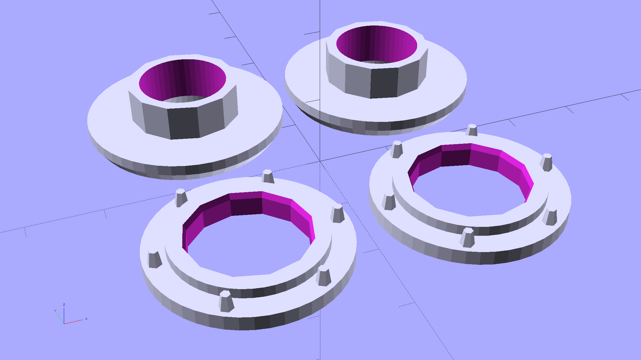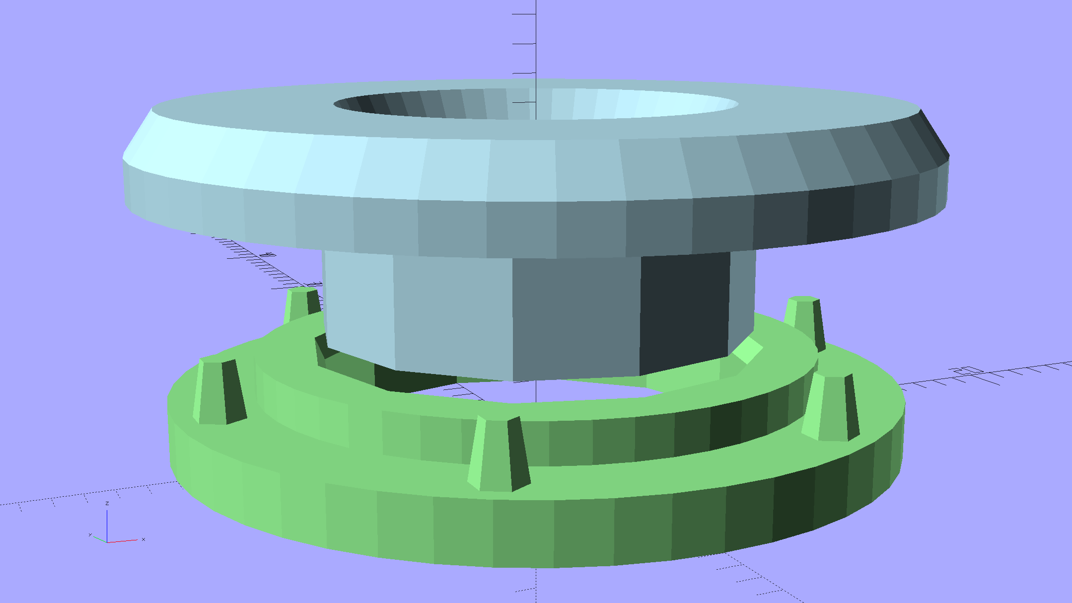 | cylinder(d1=2.5,d2=3*ThreadWidth,h=4.0,$fn=6); | |