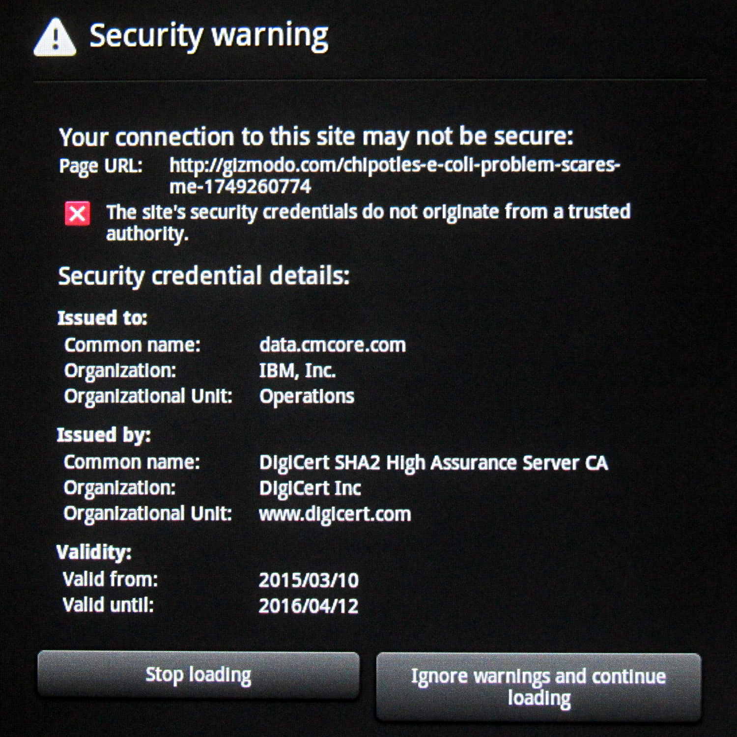 People who know what they’re talking about tell me there’s no way for ordinary civilians, such as I, to evaluate the validity of the “credentials” described by that pop-up. In this case, the credential apparently comes from DigiCert, which ought to be trust-able, and was issued to cmcore.com, an actual IBM subsidiary that apparently does Web analytics.