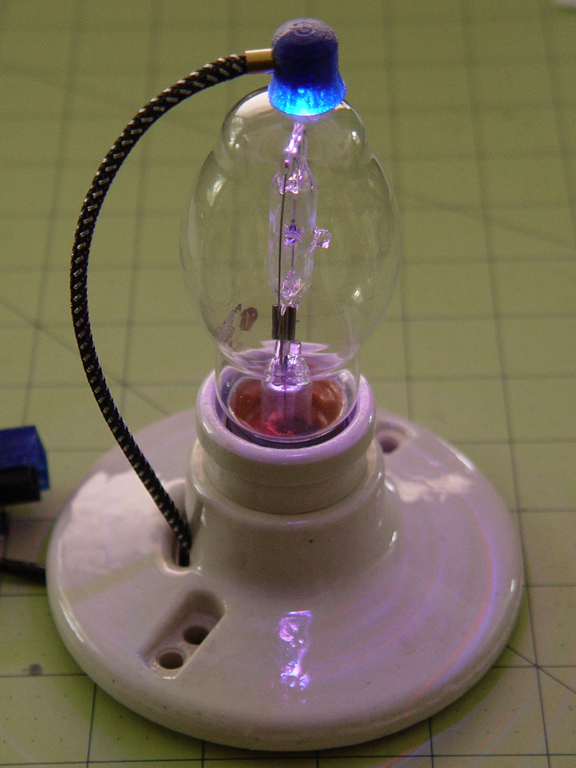 I’m still having fun playing with high voltages. The VFD projects are just 30V or so, the nixie ones 180, the CRTs 600 – 9000V, and the musical Jacob’s ladder 15kV or so. The exhaust pip on the top of tubes makes a nice anchor point/diffuser for LED lights, if you want to go that way. I’ve found that old mouse cords make good multiconductor ersatz flying leads. Old projector bulbs sometimes contain fancy filaments, reflectors, heat shields, and so forth, so they’re also good candidates for LED illumination.