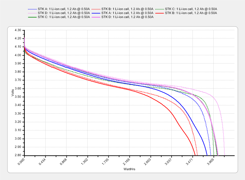 Running the camera for 27 minutes requires 2.8 W·h, meaning 37 minutes should require 3.8 W·h. The curve says that’s the capacity at the 2.8 V test cutoff, suggesting the camera also has a 2.8 V cutoff.