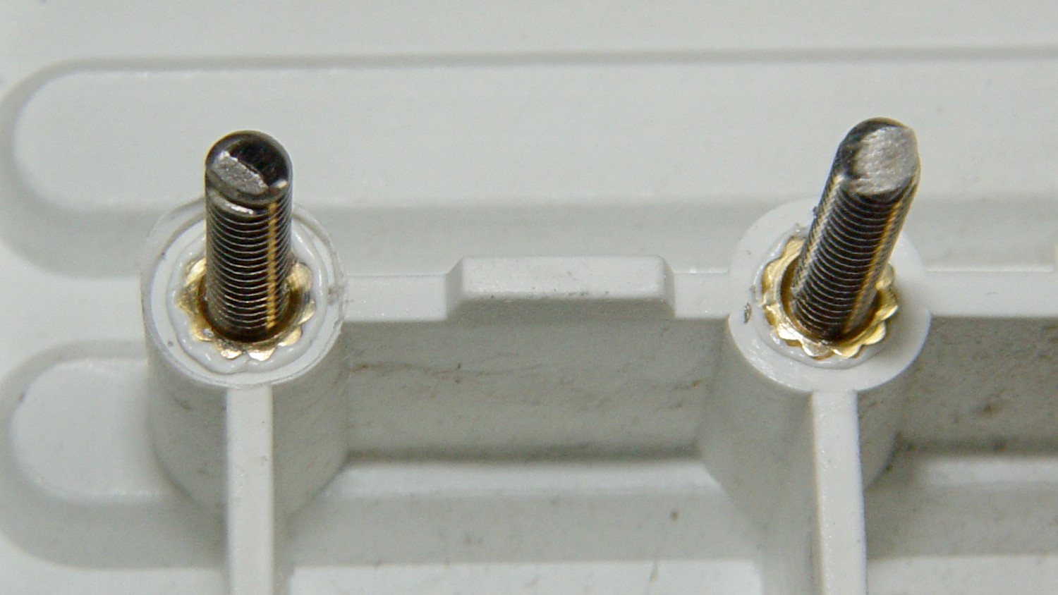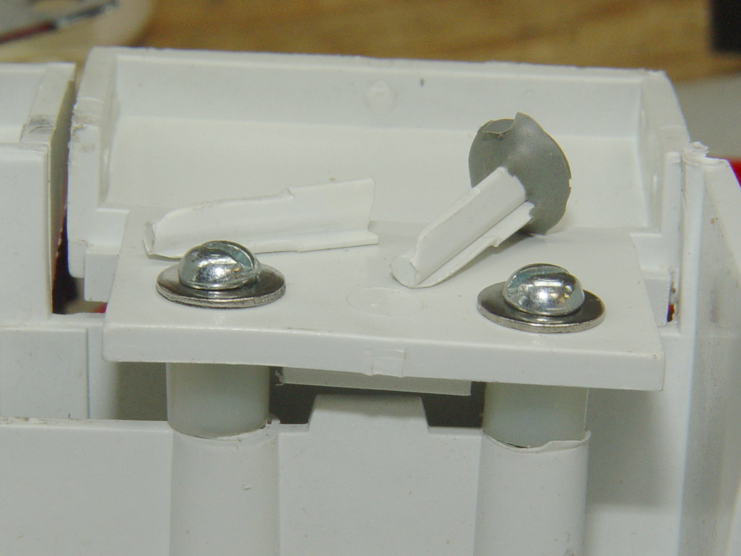 The two broken pegs sit disconsolately atop the tab, with the crushed section of their ribs showing their depth of insertion in the bosses. Note that the tab sits proud of the grill, originally supported entirely by the pegs and stopped by the square block in the middle, with no support or alignment on any side.