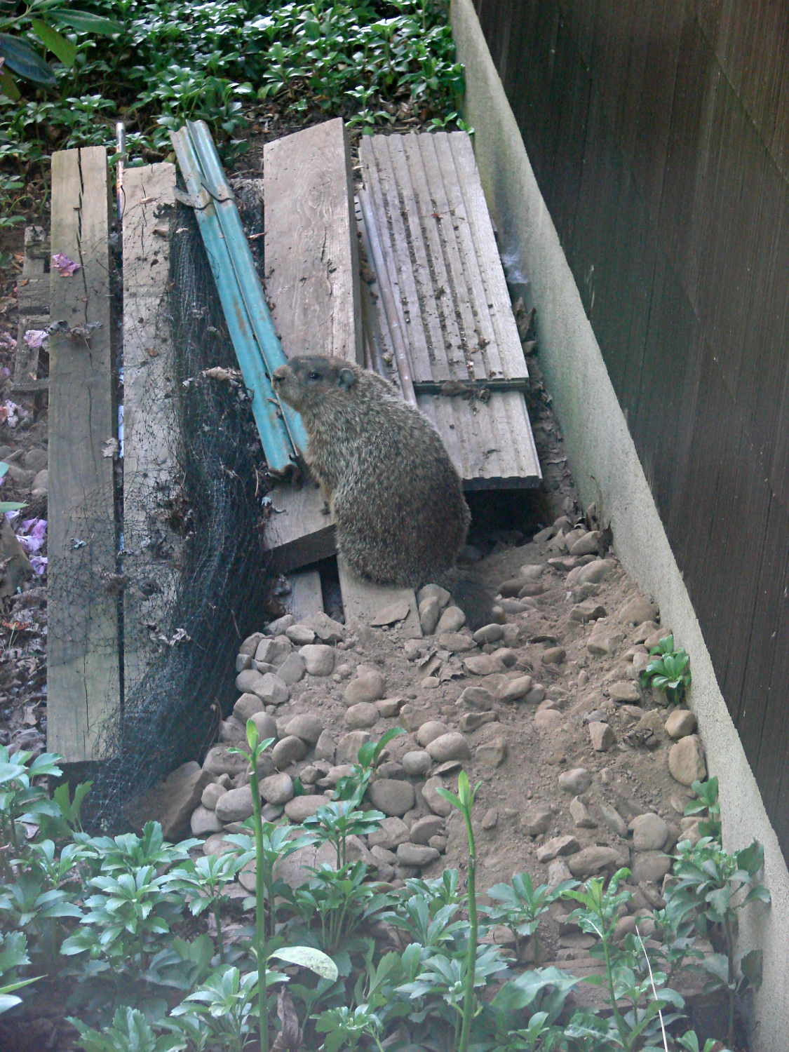Our new back-yard groundhog made extensive renovations and improved the landscaping before moving into the unoccupied burrow against the garage wall:
