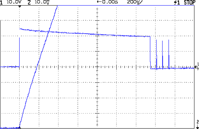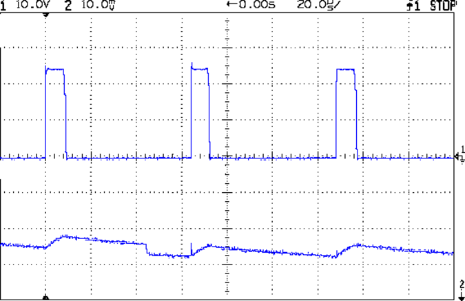 With everything in position and the Tek 6303 probe set for 10 A/div, this is what happens when you push the deadman switch: