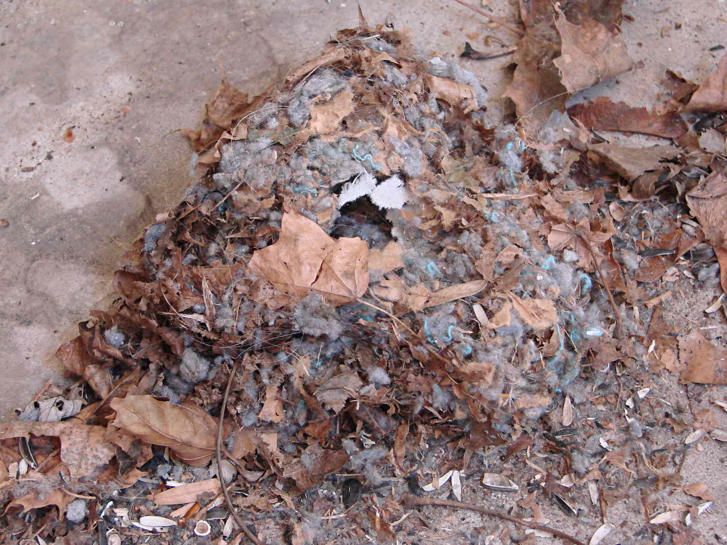 This year’s mouse survived the winter under the tool rack, perhaps due to living inside a well-insulated ball made from leaf fragments, dryer fuzz, and random stuff: