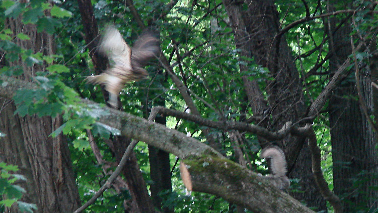That little squirrel instantly pasted itself to the bottom of the branch and escaped. This time, anyway.
