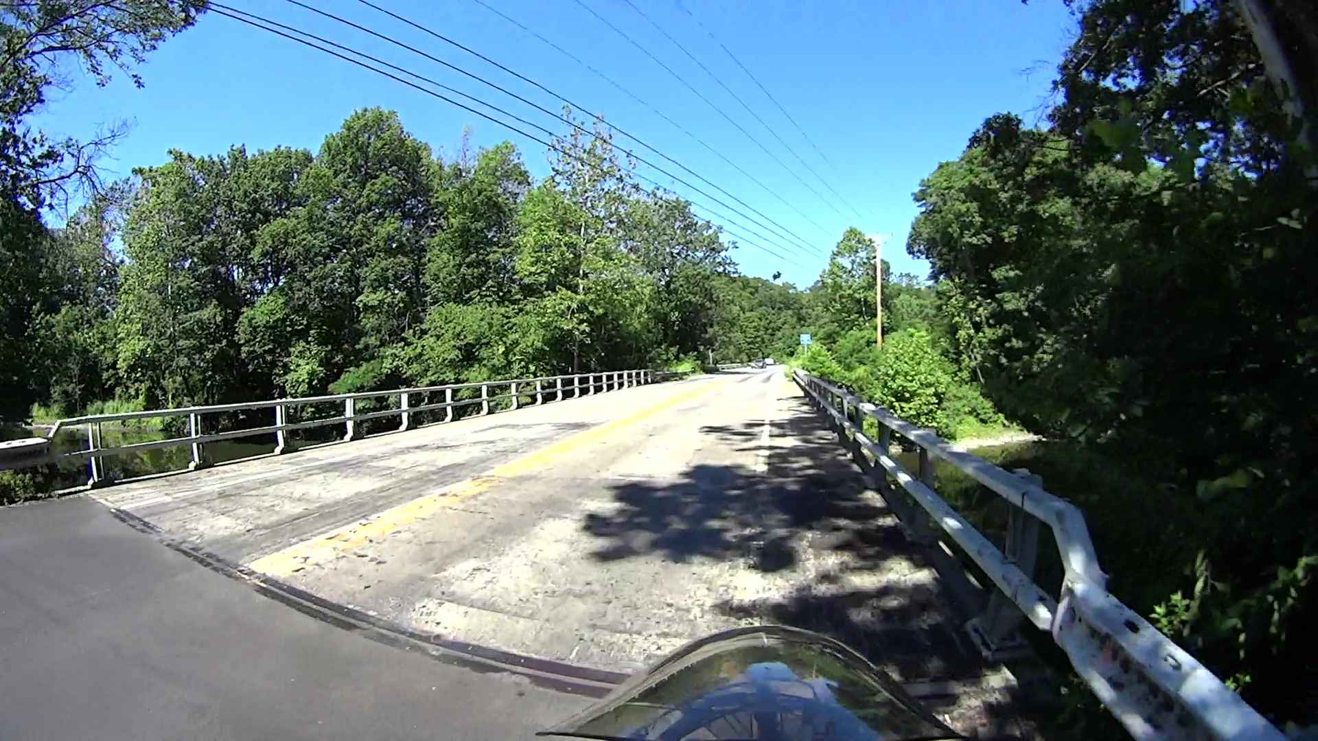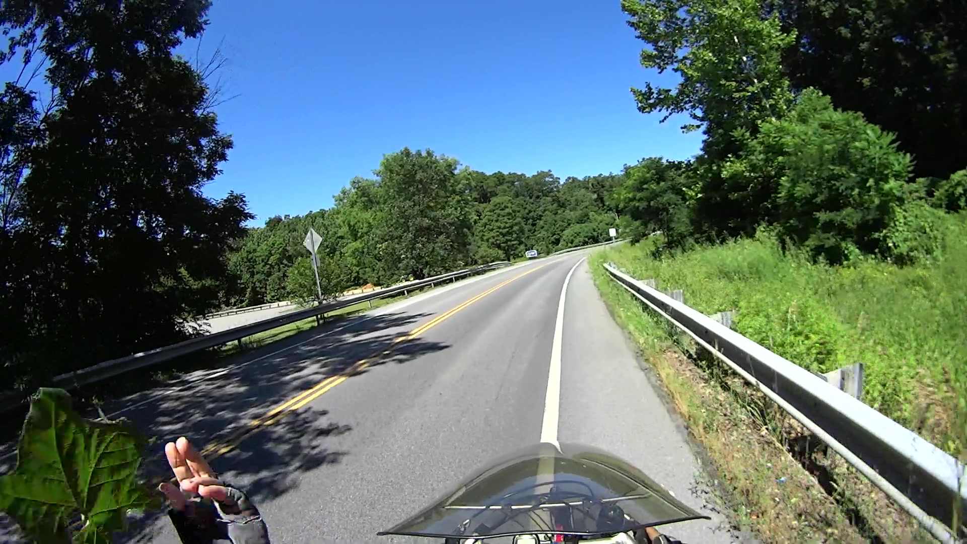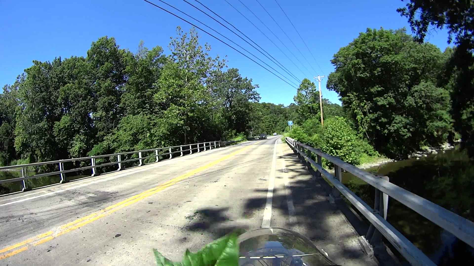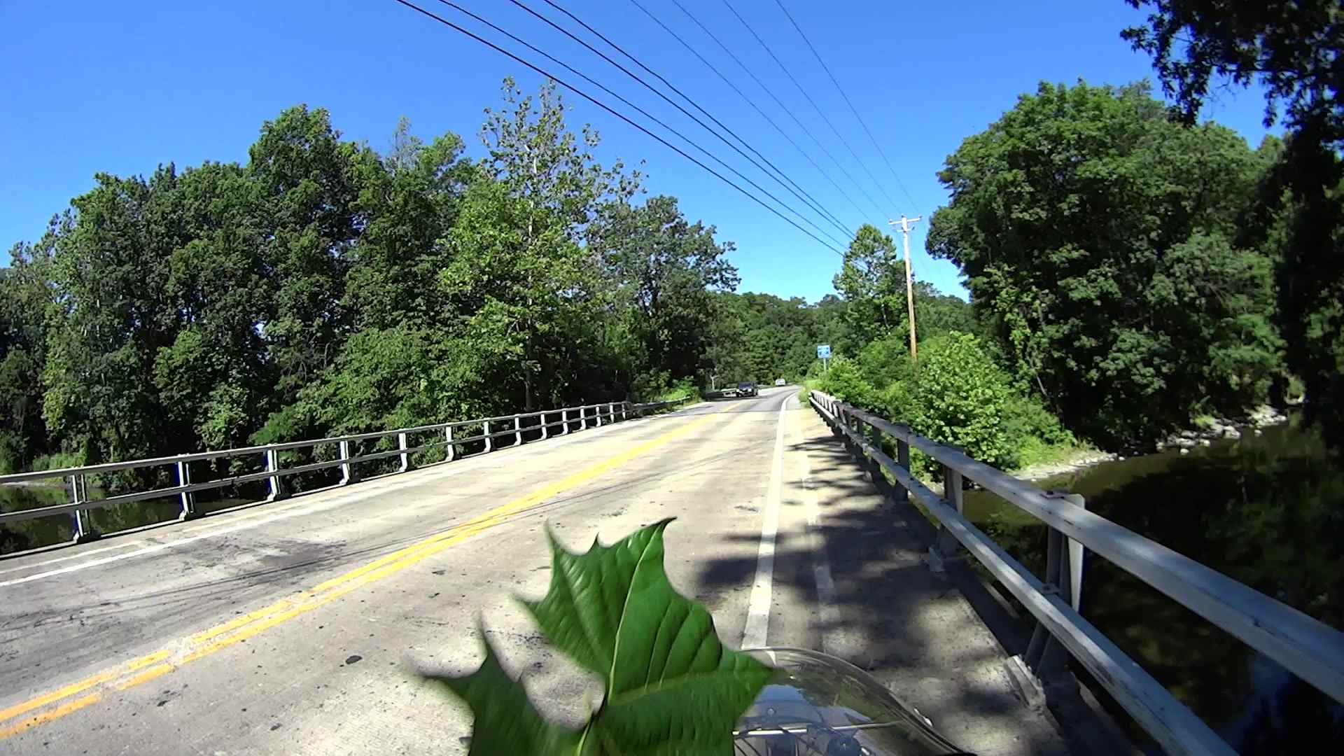 T=7.483 s – Four seconds later, I’m off the bridge and past the bushes overhanging the guide rail, so I can finally spare a hand: