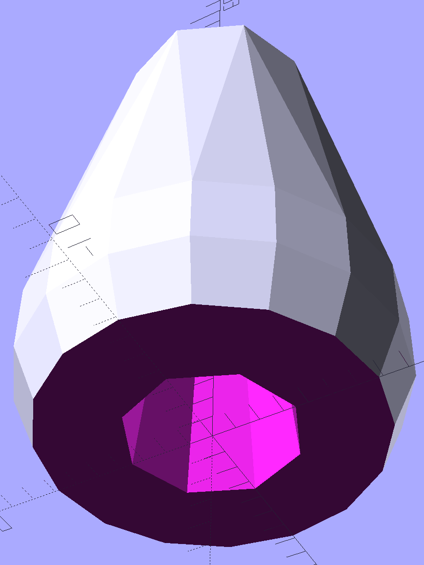 | sphere(d=Cap[OD2],$fn=2*NumSides); // round the bottom just a bit | |
