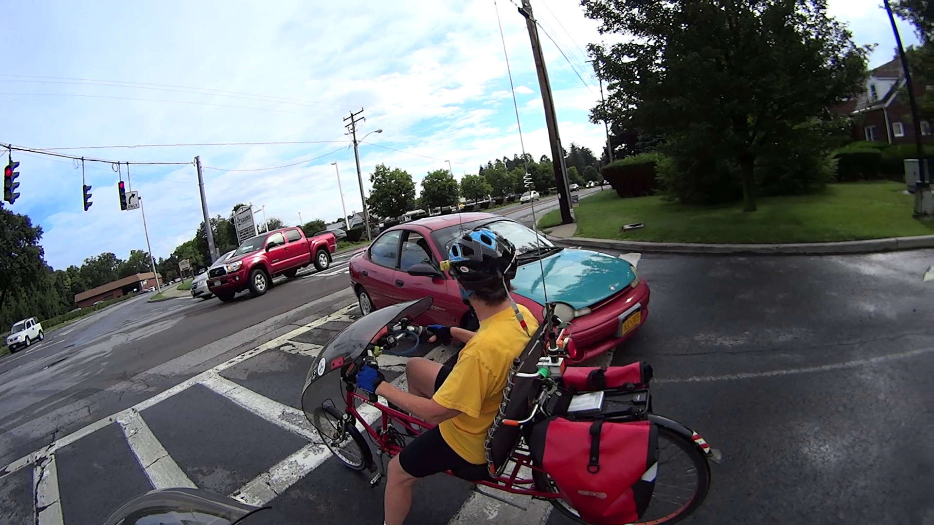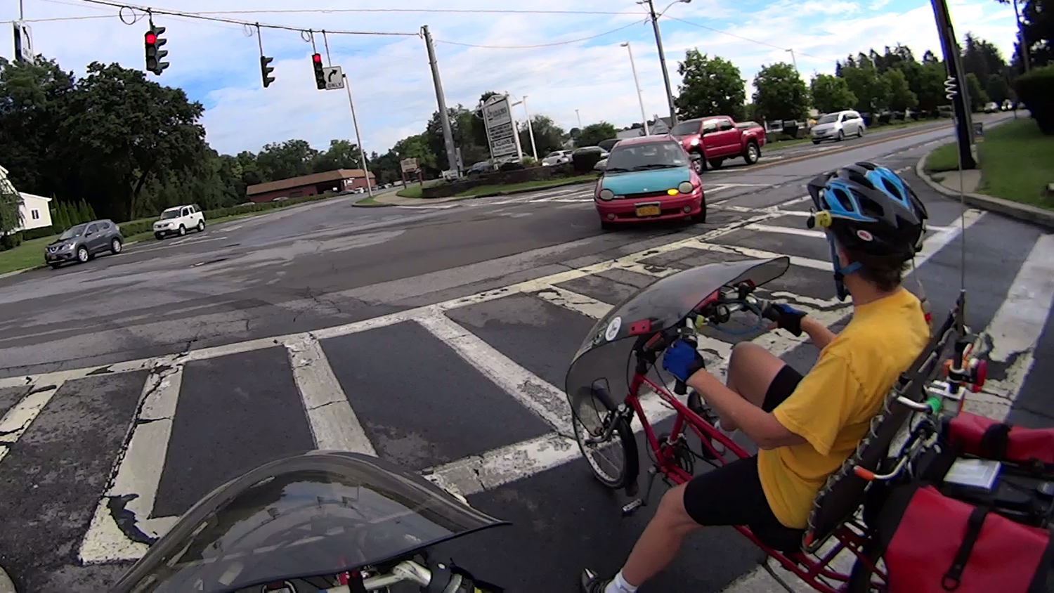 If we both line up on the traffic signal sensor loop, it seems to detect us; Mary’s on the right side of the loop, I’m rolling along the left side. This seems to be an old-school dipole loop, not a quadrupole.