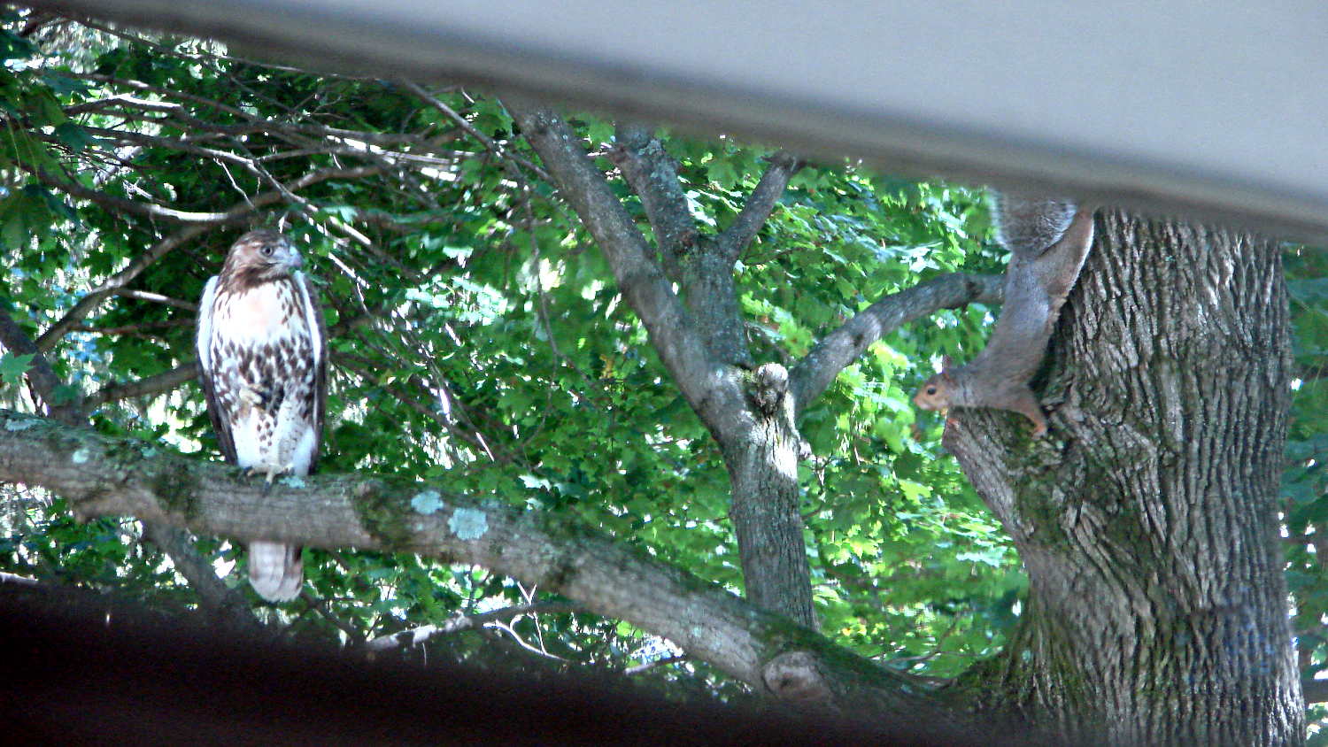 After a minute or so, a squirrel ran up the maple and began taunting (?) the hawk: