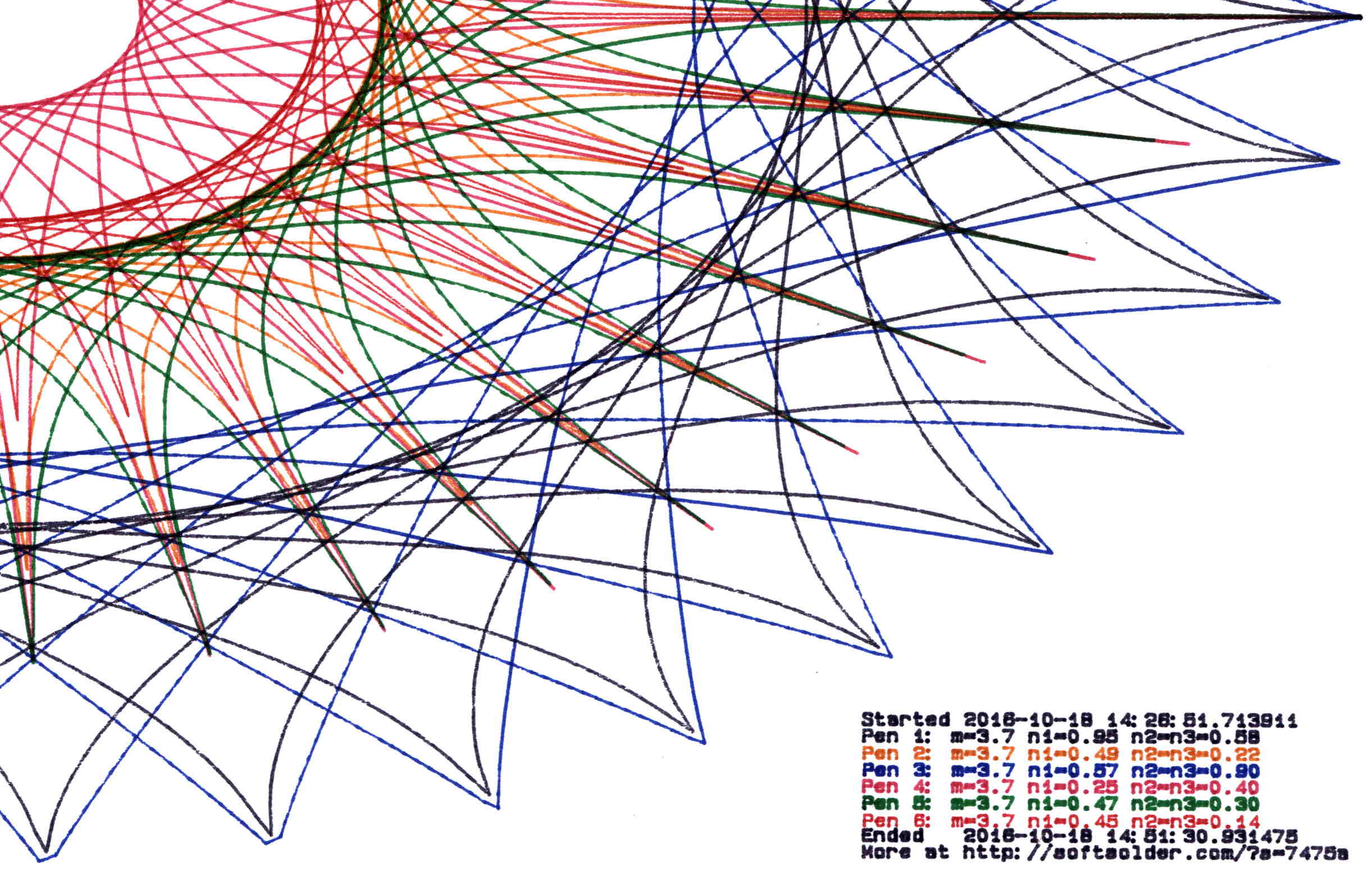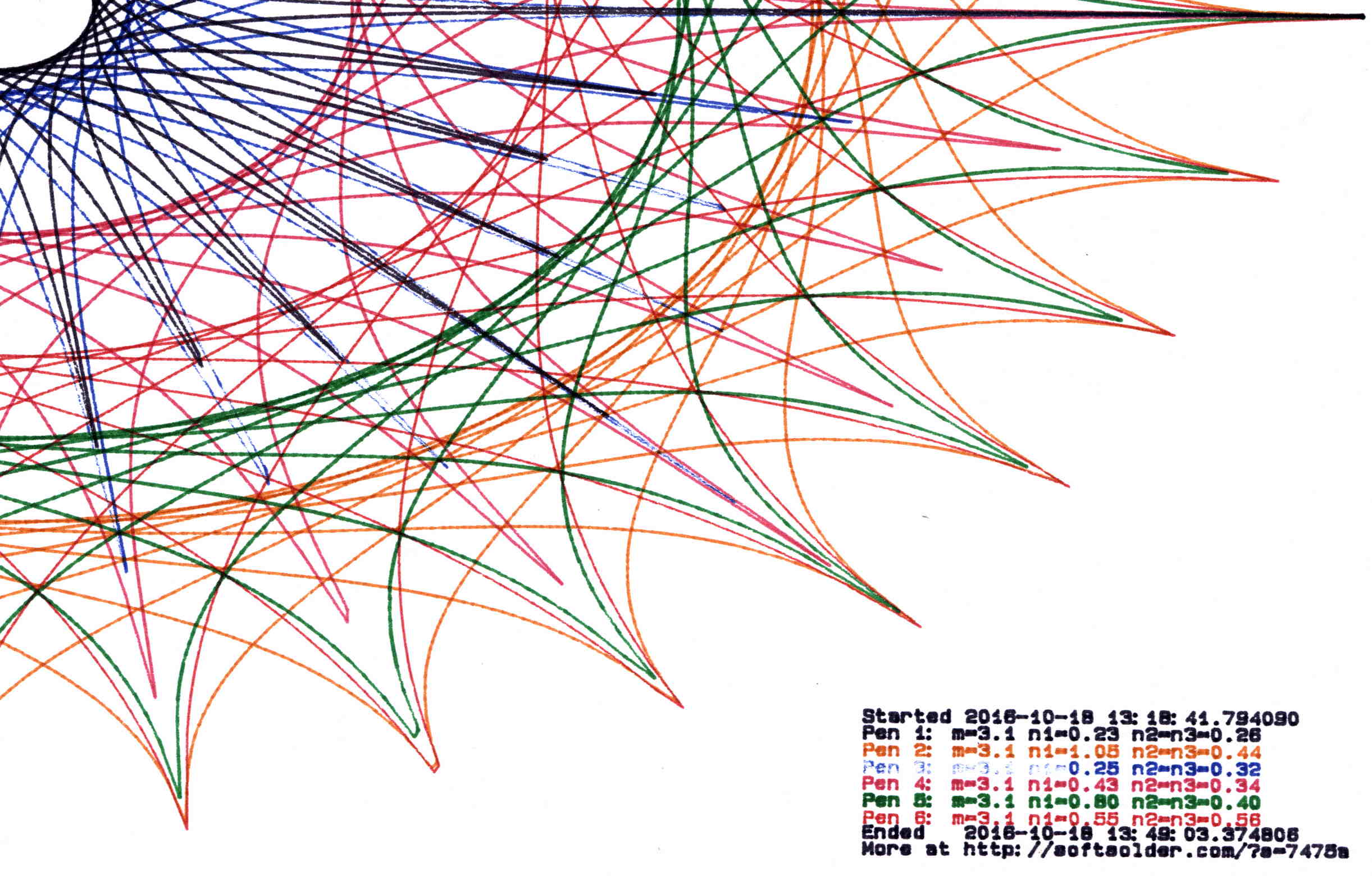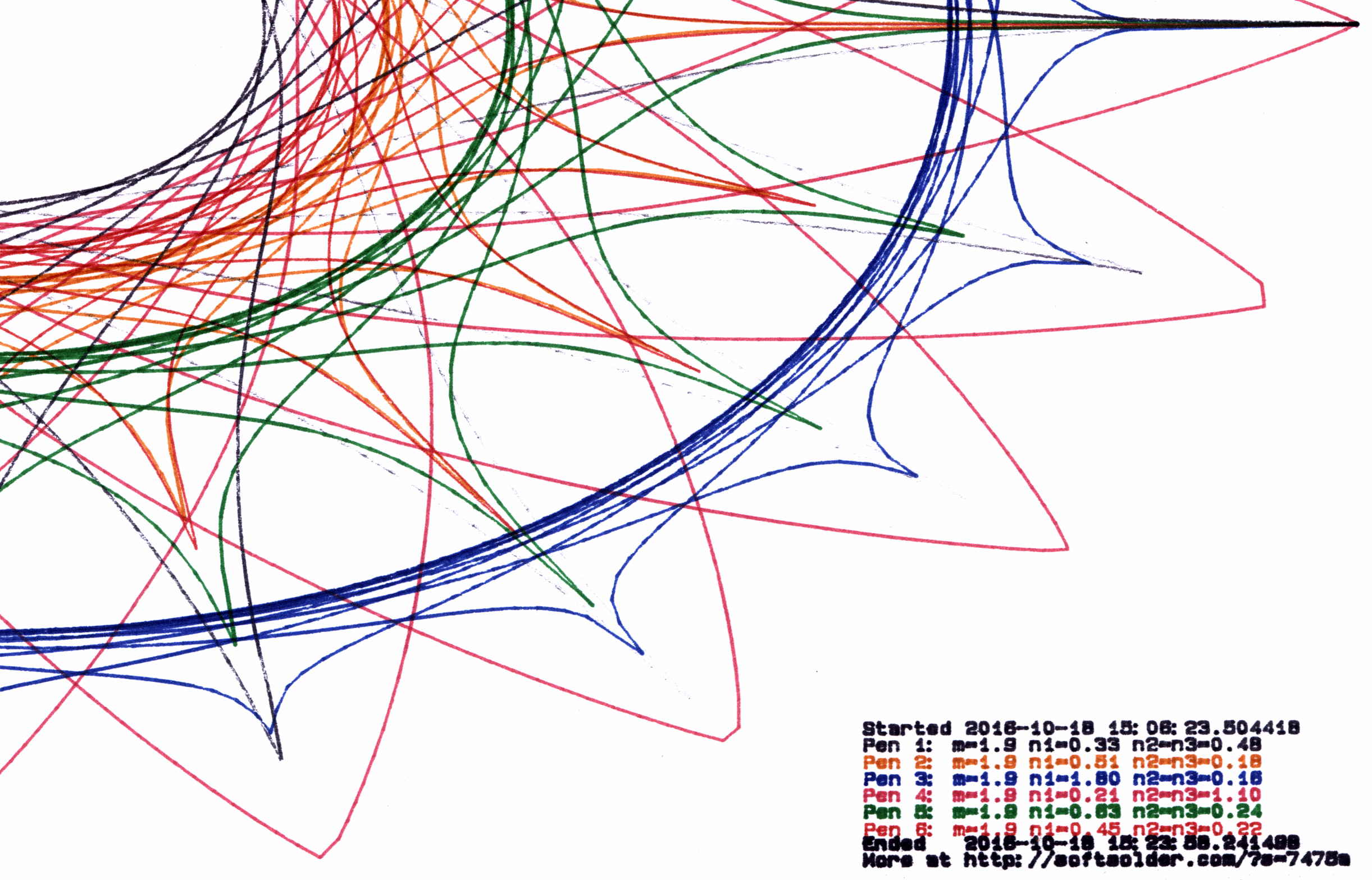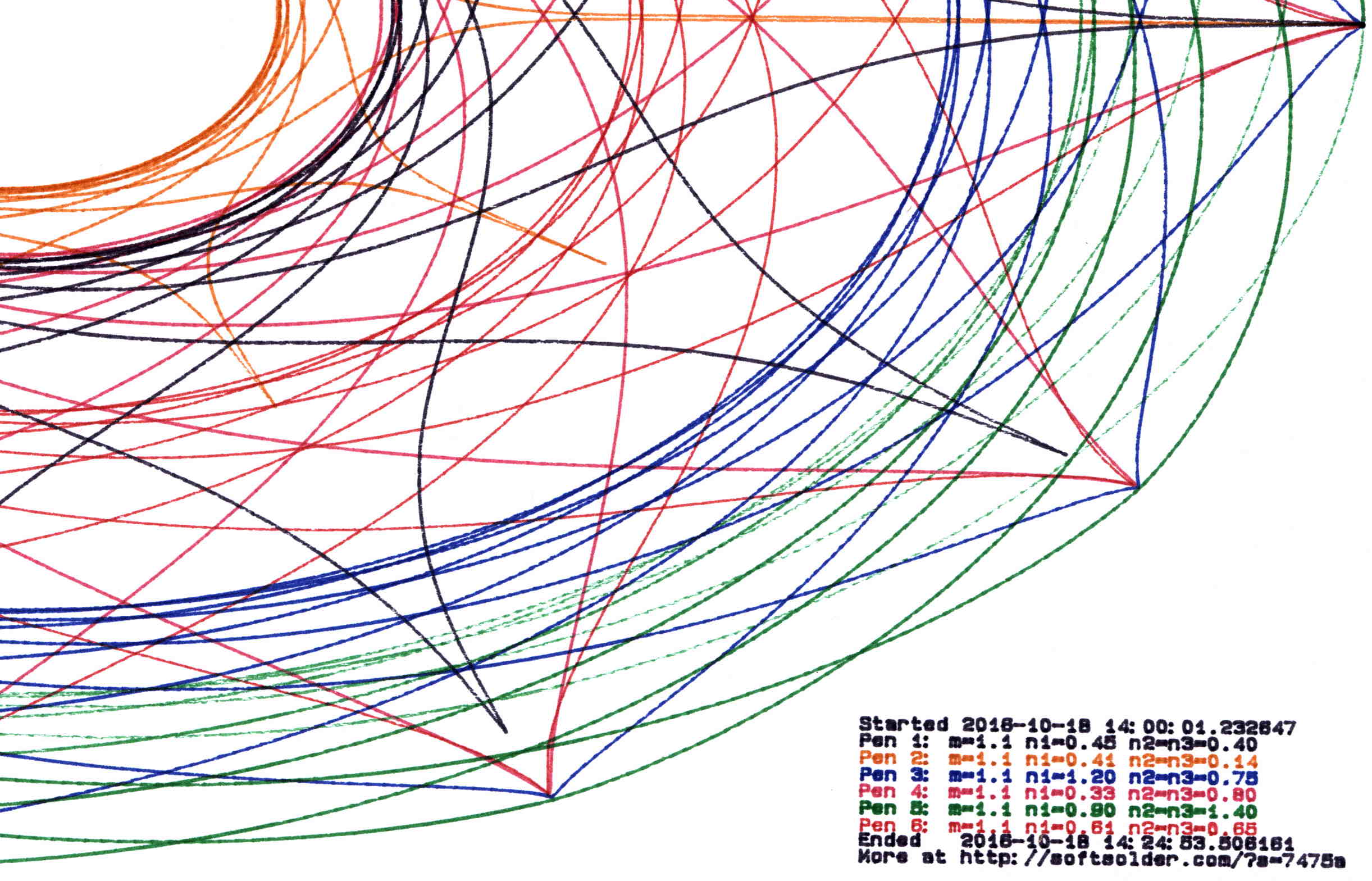 The original SuperFormula equation produces points in polar coordinates, which the Chiplotle library converts to the rectilinear format more useful with Cartesian plotters. I’ve been feeding the equation with 10001 angular values (10 passes around the paper, with 1000 points per pass, plus one more point to close the pattern), which means the angle changes by 3600°/10000 = 0.36° per point. Depending on the formula’s randomly chosen parameters, each successive point can move the plotter pen by almost nothing to several inches.