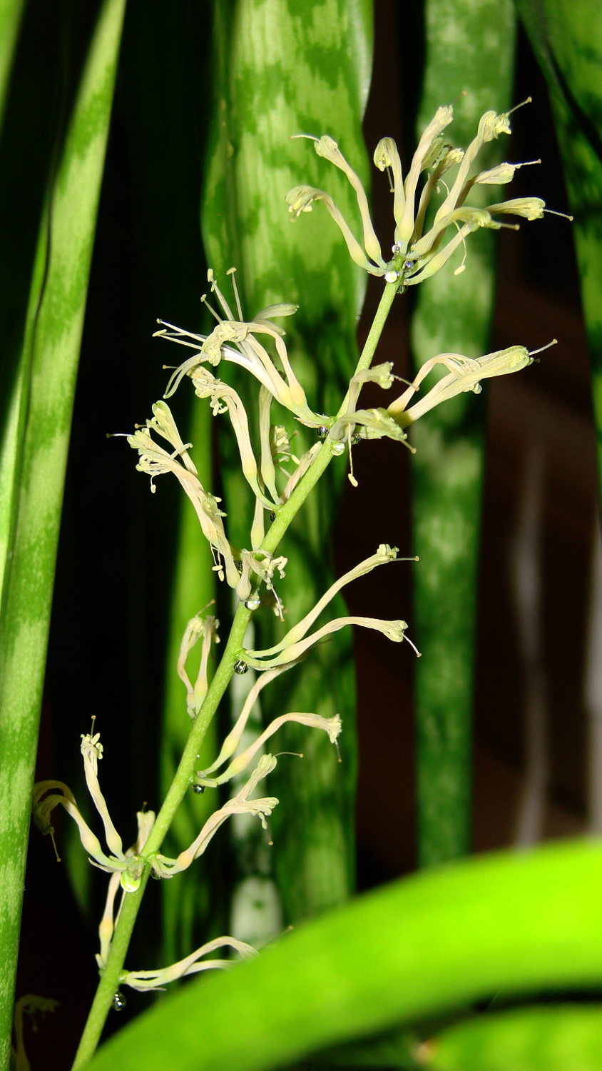 The blossoms produce so much nectar that the droplets near the base of each flower eventually fall off, making a mess on the floor if the stalk tilts over far enough.