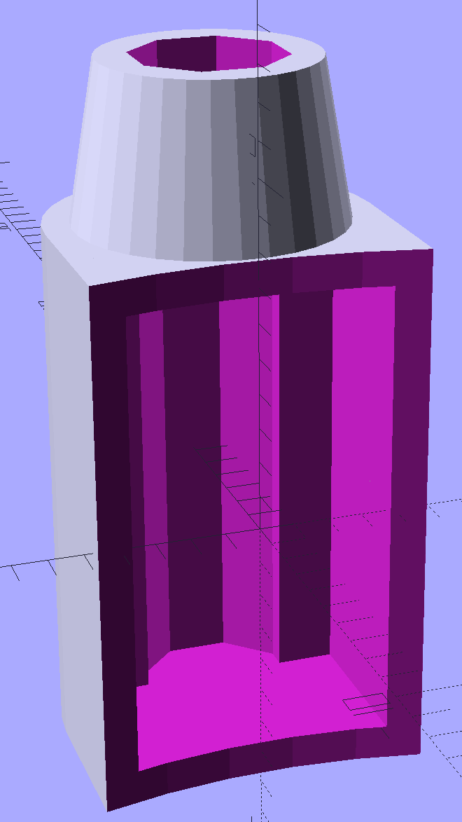 The model won’t build without support, because the open side is curved and there’s a big hole in the top: the threads can’t bridge across the entire top. I thought about building it with the ferrule downward, but then the surface around the ferrule needs support. This way, at least, all the support scarring happens inside the box where nobody will ever see it.