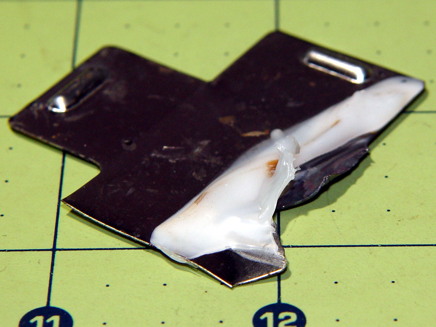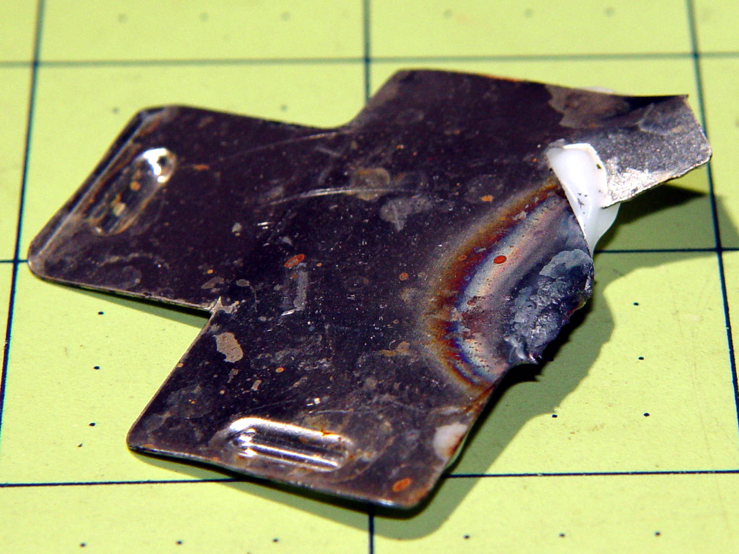 Sacrificing a scrap EMI shield from a junked PC as the electrolysis anode, I grabbed a tab with the battery charger clamp: