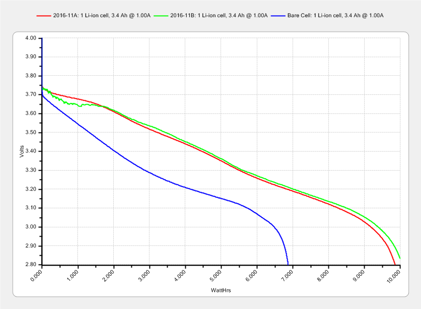 I picked 1 A as a reasonable value for their intended use in flashlights and maybe a helmet camera. Unlike some other cells in the recent past, these deliver 3.0 A·h, reasonably close to their rated 3.4 A·h capacity at a (presumably) lower current.