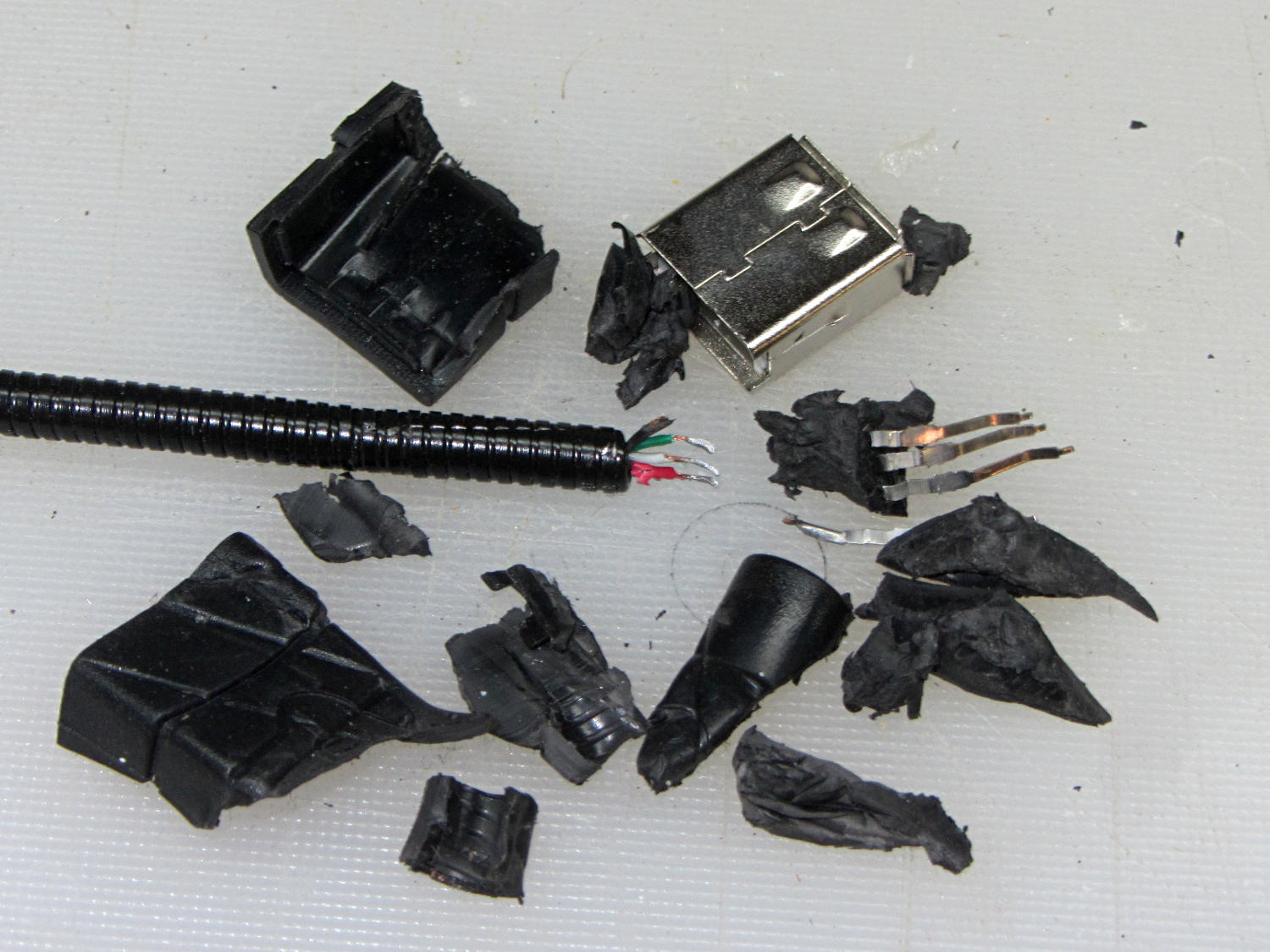 The bandsaw needs more light on the blade, but a fixed lamp will certainly get in the way of something. Pondering the solution space of available parts suggests a COB LED on a flexible gooseneck, which led to some 30 cm USB extenders, then smashing one of the connectors to reveal the wiring inside: