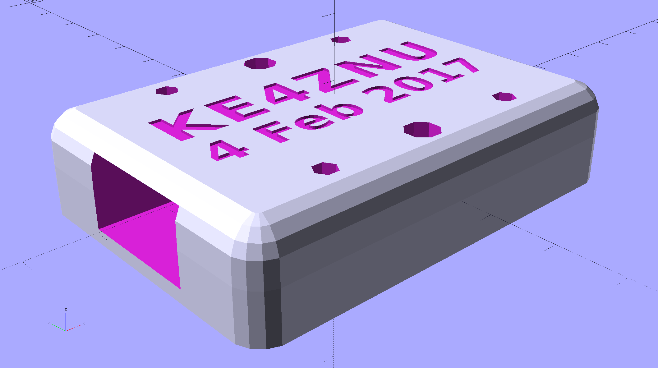 | text(text="KE4ZNU",size=8,spacing=1.10,font="Bitstream Vera Sans:style=Bold",valign="center",halign="center"); | |