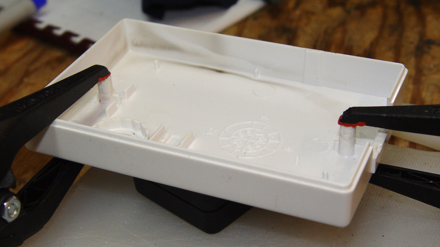 Another X10 RF transciever, this one made for IBM (!) a long time ago, emerged from the heap with its case falling apart: the plastic bosses that should anchor the screws had broken off, then cracked radially. Given that I was probably going to toss it anyway, for reasons that will soon be obvious, I tried repairing the bosses just for practice.