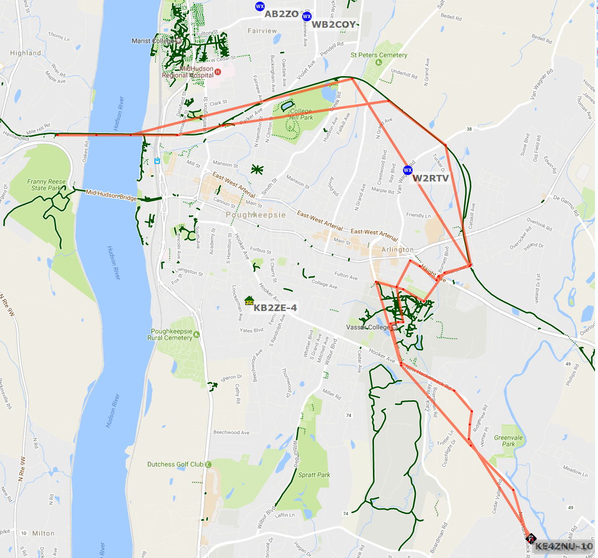 That straight line connecting two successive APRS position reports just happens to pass through W2RTV’s position. Riding in the other direction, a “middle point” sent from the bridge over Van Wagner Rd pulls the lines closer to the rail trail.