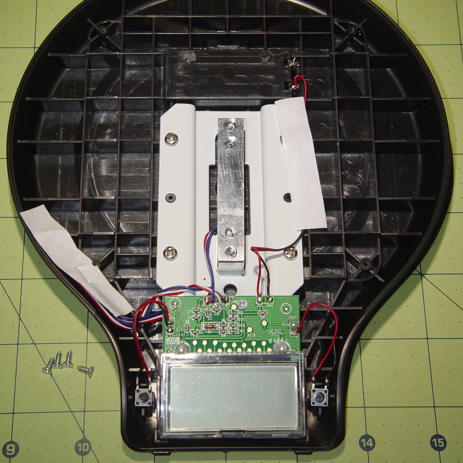 An unfortunate incident put enough water inside our kitchen scale to, ummm, render it inoperative. After a day of drying proved unavailing, I had nothing to lose by disassembling it.