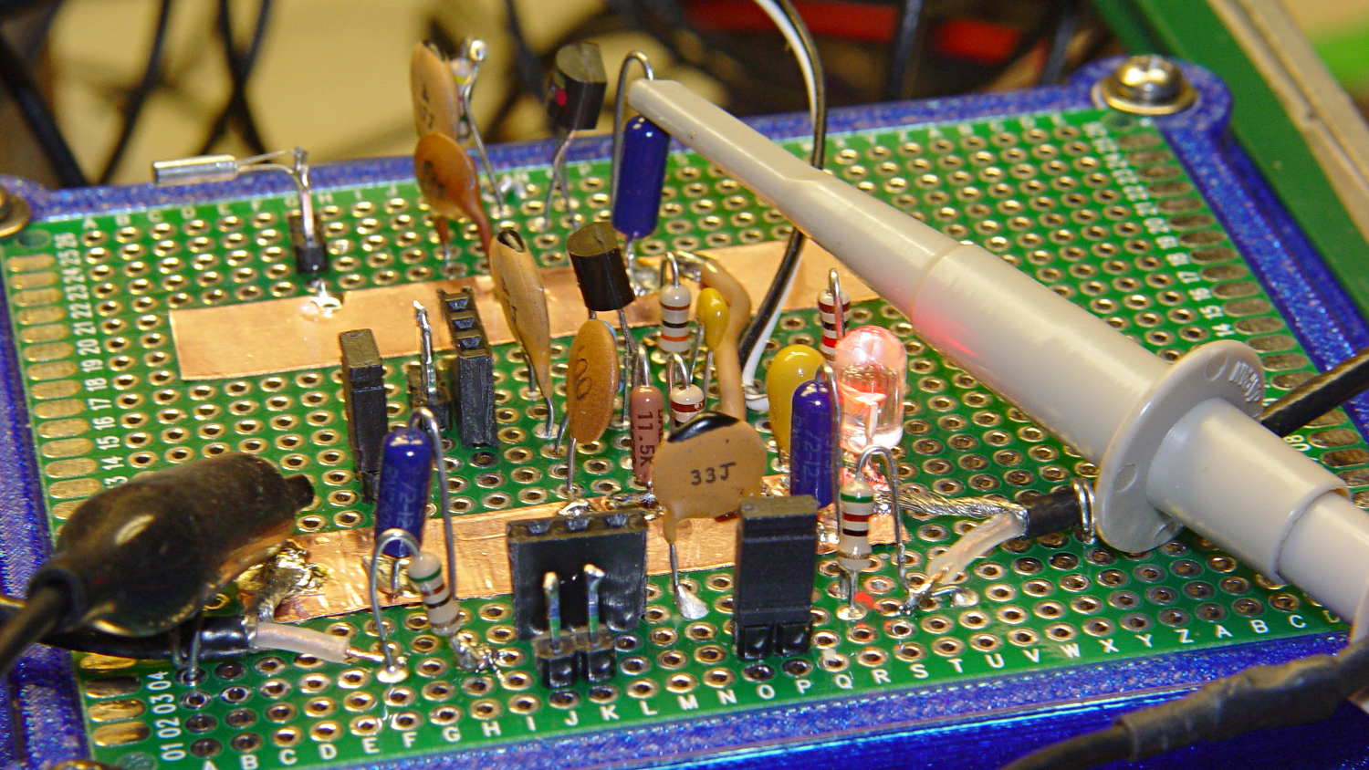 The proto board has two oscillator circuits behind the crystal test fixture, with the 32 kHz resonator hanging from the header pins on the lashup toward the rear: