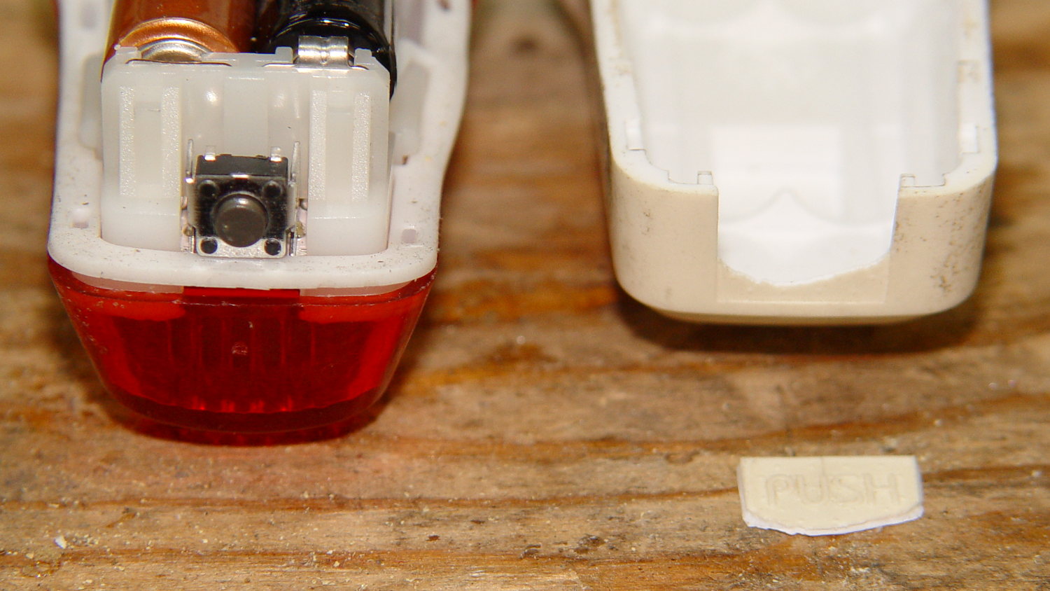 The white plastic case has a thin section labeled PUSH over the switch. After five years of exposure to the sun (it faces upward on her bike) and upwards of 2000 pushes (5 years x 200 rides/year x 2 pushes/ride), the edges of that little plate cracked, it slipped inward, and jammed the switch button.