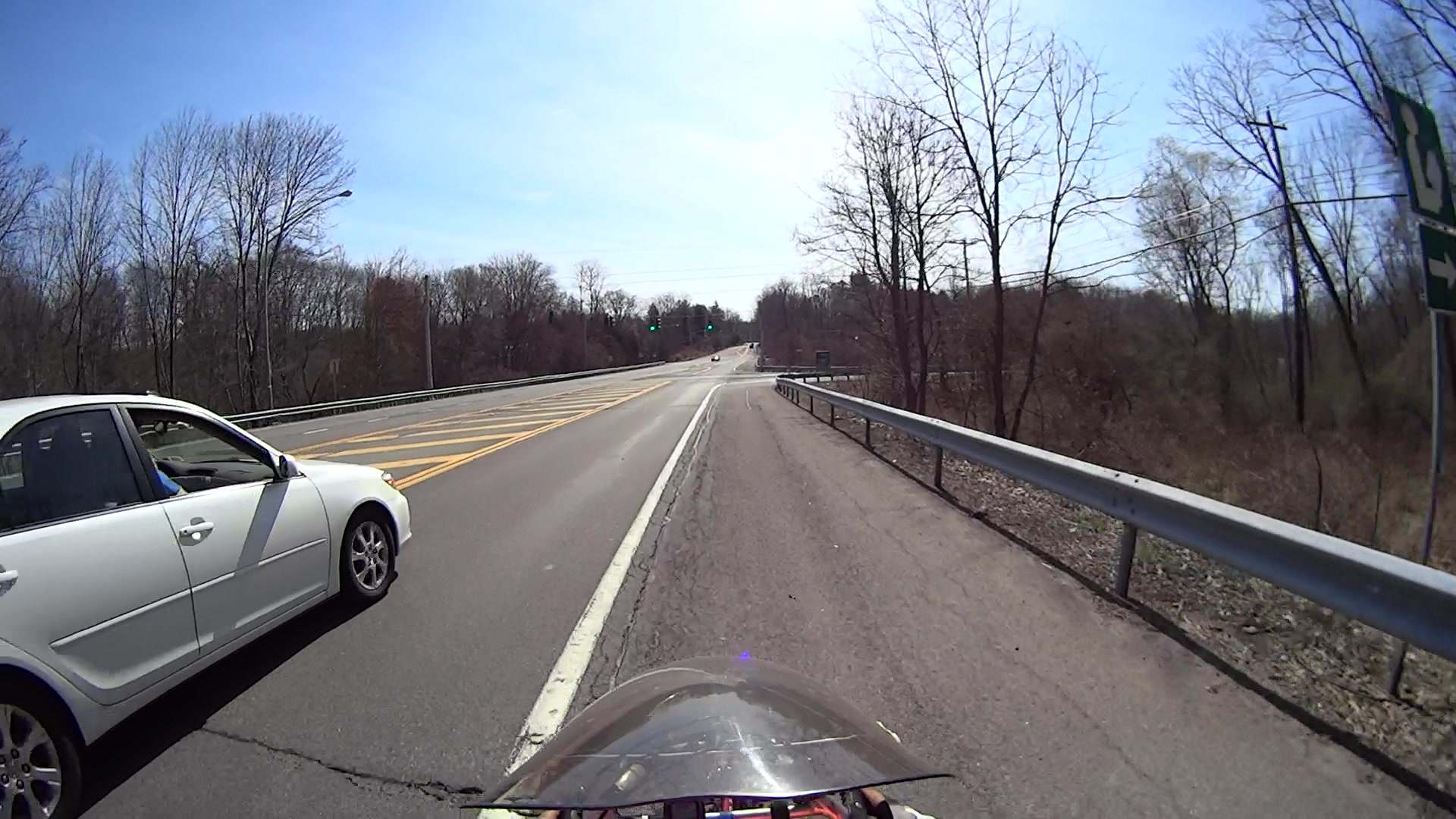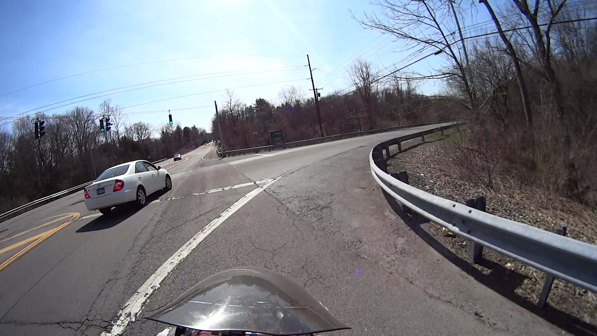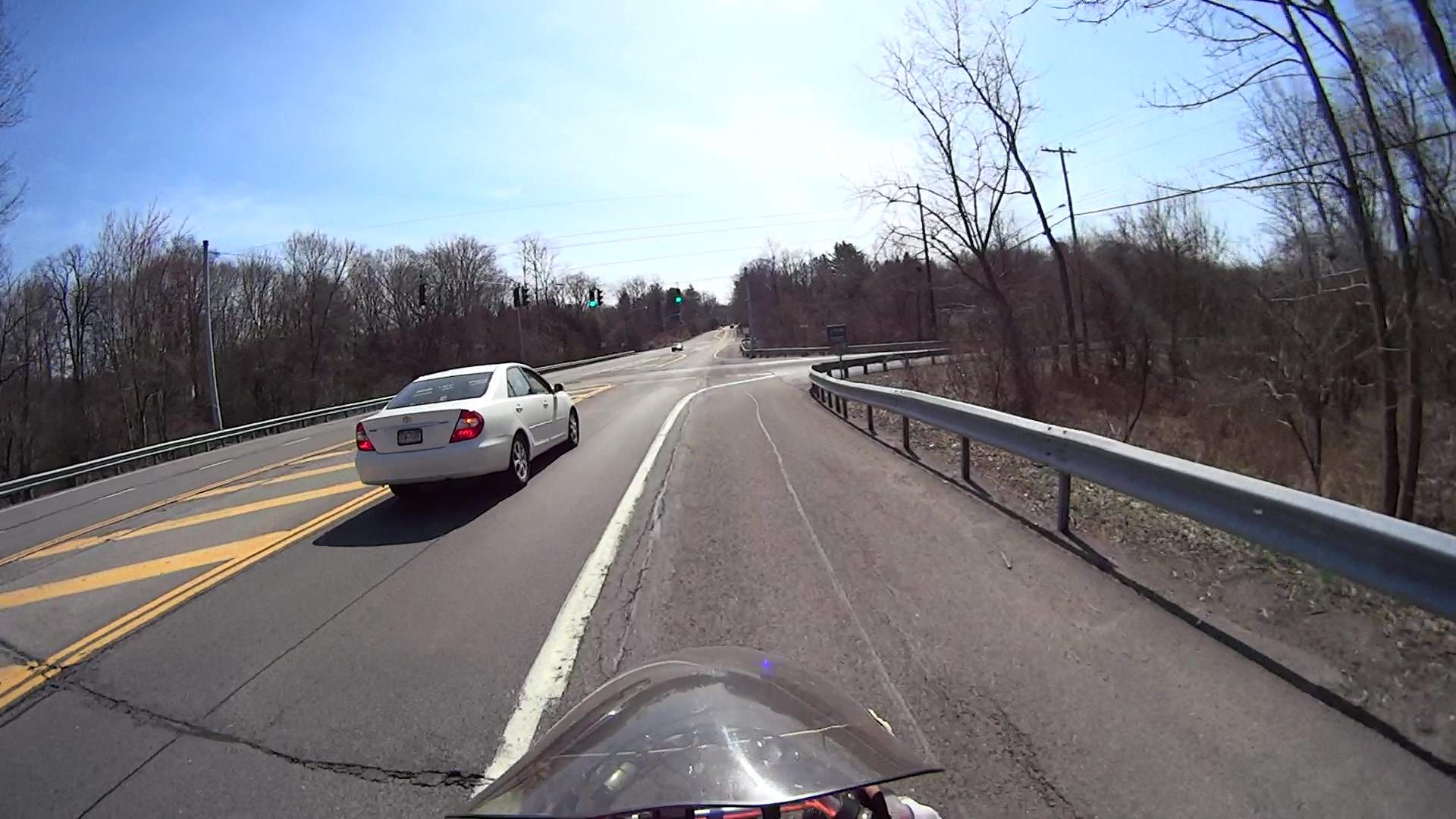 Now I can see the car’s right turn signal, so this might not end well. I can’t jam on the brakes and avoid a collision by dumping the bike at speed; I’ll slide under the car in the middle of the turn.