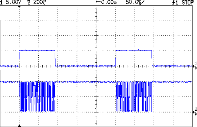 The burst in the top trace shows the five SPI writes to the DDS (one pulse per byte, with the hardware handling the serialization) and the bottom trace shows four I²C bus writes to the DAC: