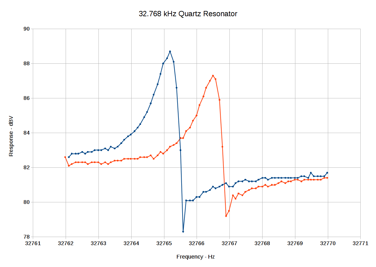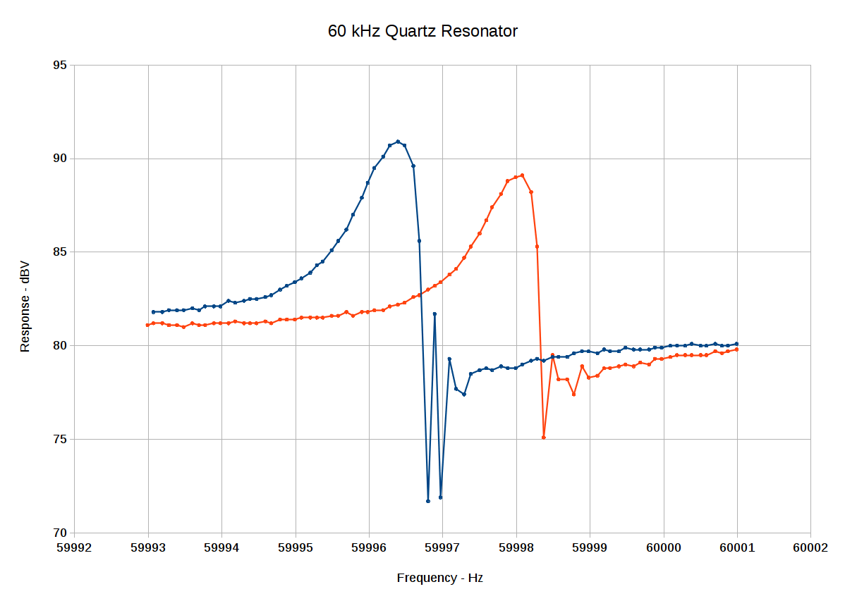 Anyhow, the series-resonant peaks look about 1 Hz wide at the -3 dBV points, more or less agreeing with what I found with the HP 8591 spectrum analyzer. The series cap is a bit smaller, producing a slightly larger frequency change in the series resonant frequency: a bit under 2 Hz, rather than the 1 Hz estimated with the function generator and spectrum analyzer.