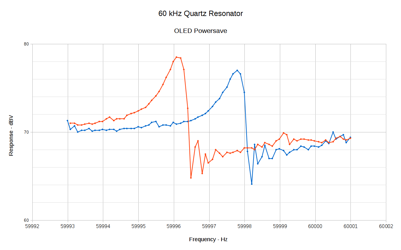The peak frequencies differ by 0.2 Hz, which is probably due to a few degrees of temperature difference. Obviously, it’s badly in need of a temperature calibration & correction.