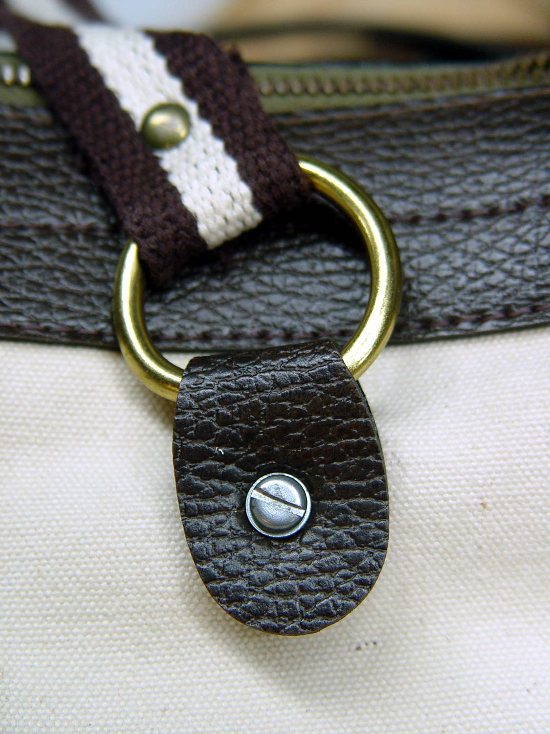 One of the leather strap anchors on Mary’s giant haul-everything-to-a-concert(*) handbag pulled its rivet through the canvas fabric: