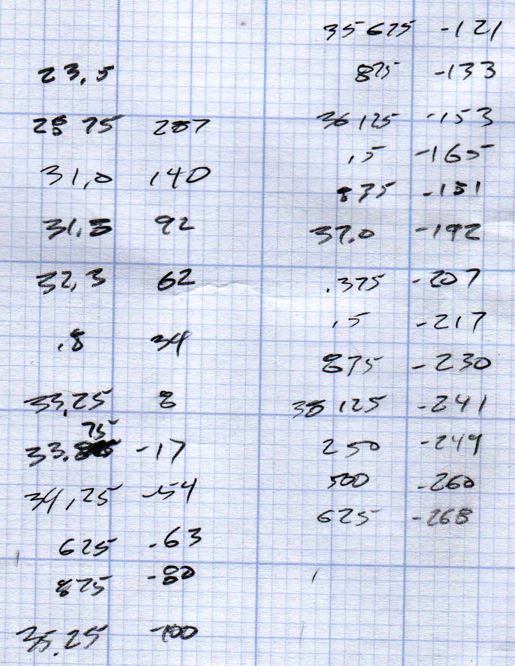 The reduced spacing between the points as the temperature increases shows how fast the oscillator heats up. I zero-beat the 10 MHz output, scribbled the temperature, noted the offset, and iterated as fast as I could. The clump of data over on the right end comes from the previous session with essentially stable temperatures.