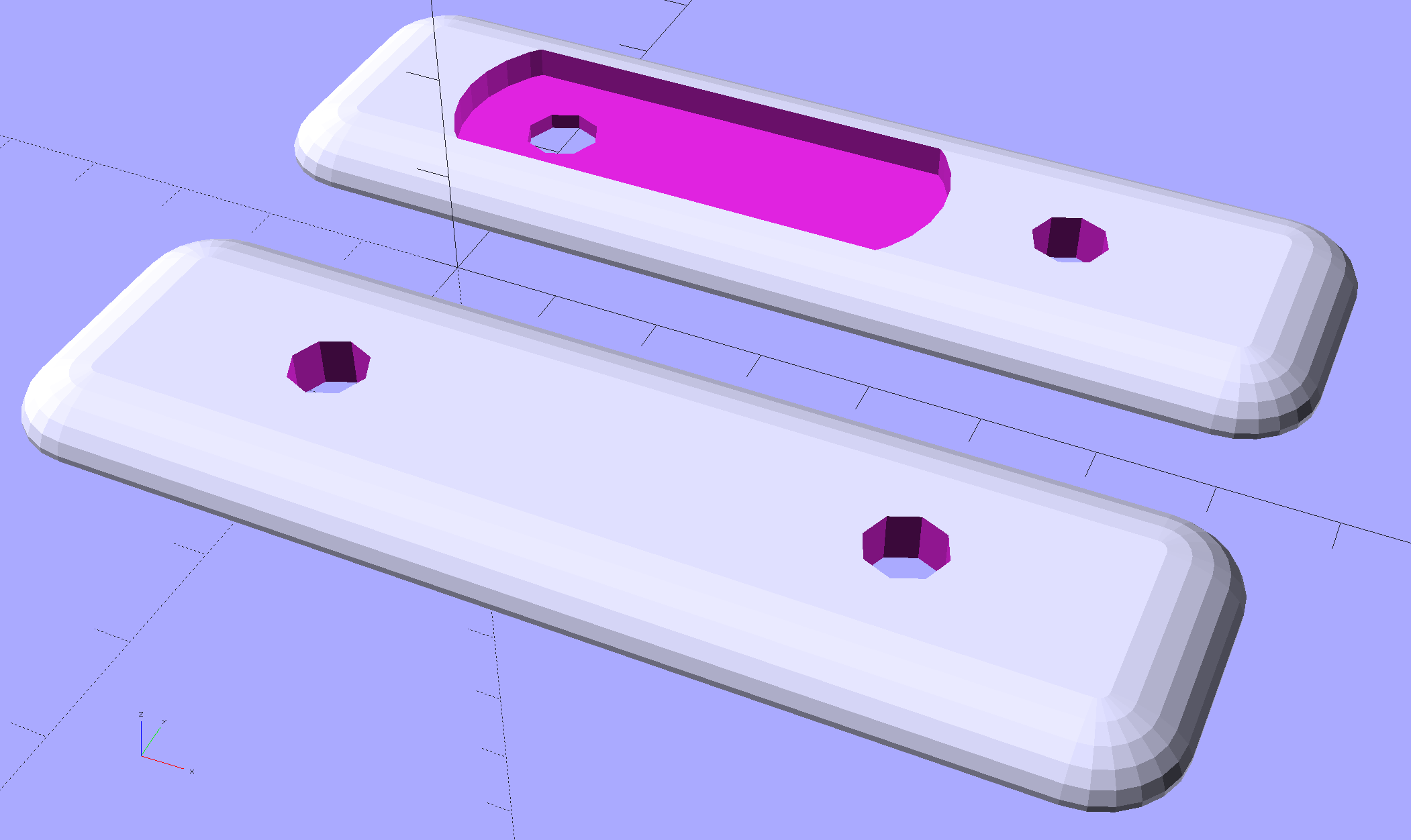 | translate([2*BracketHoleOC,0,-Protrusion]) // screw holes | |