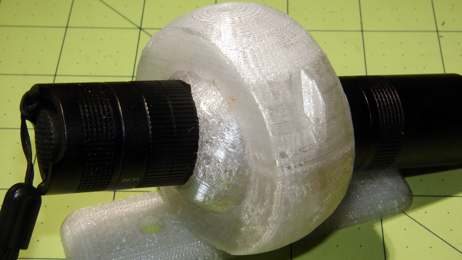 The inner cylindrical section is smooth enough to require a wrap of tape around the flashlight grip to anchor it in position. The tape adheres to the flashlight and squishes into the ball’s layer lines, even under mild pressure from the 2 mm screws. The outer clamp ring applies compression to the ball, so the tiny screws need not withstand much force at all, which is a good thing.
