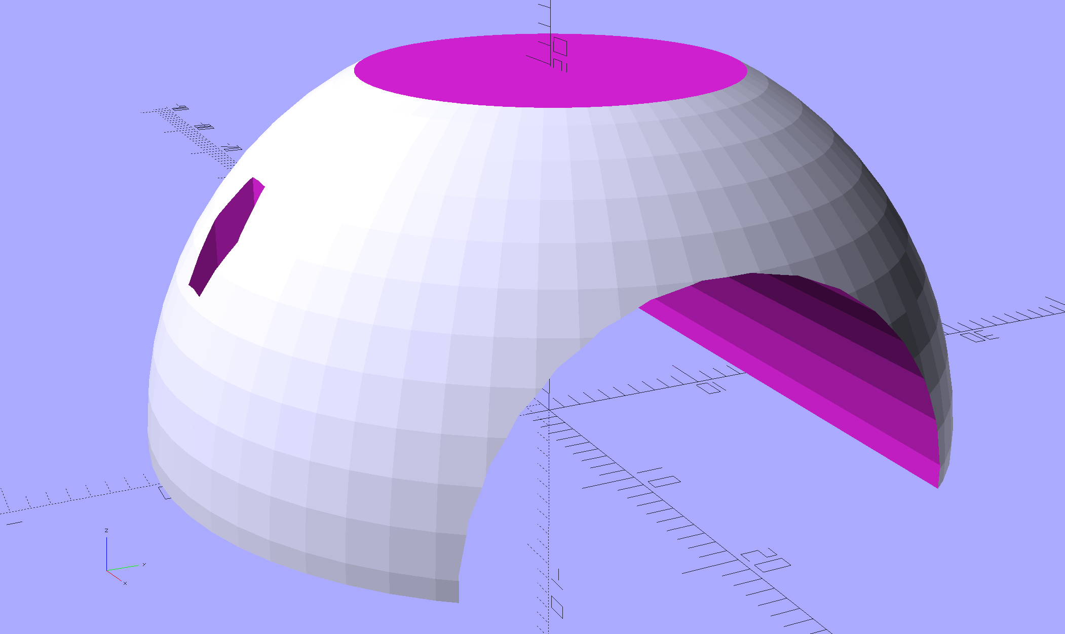 | translate([0,0,BallOD – BallThick/2]) // slice off top = bottom for E-Z build | |