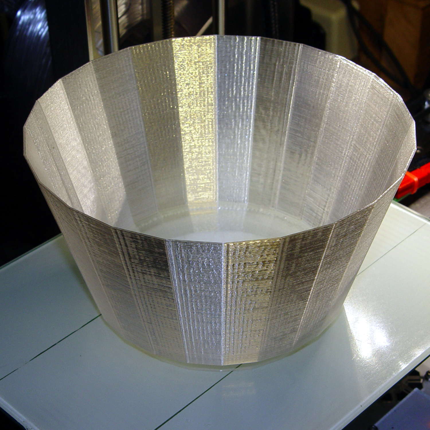 Producing what looks like thin flowerpot required just shy of seven hours of print time, as it’s almost entirely perimeter, goin’ down slow for best appearance. The weird gold tone comes from the interaction of camera flash with warm-white CFL can lights over the desk.