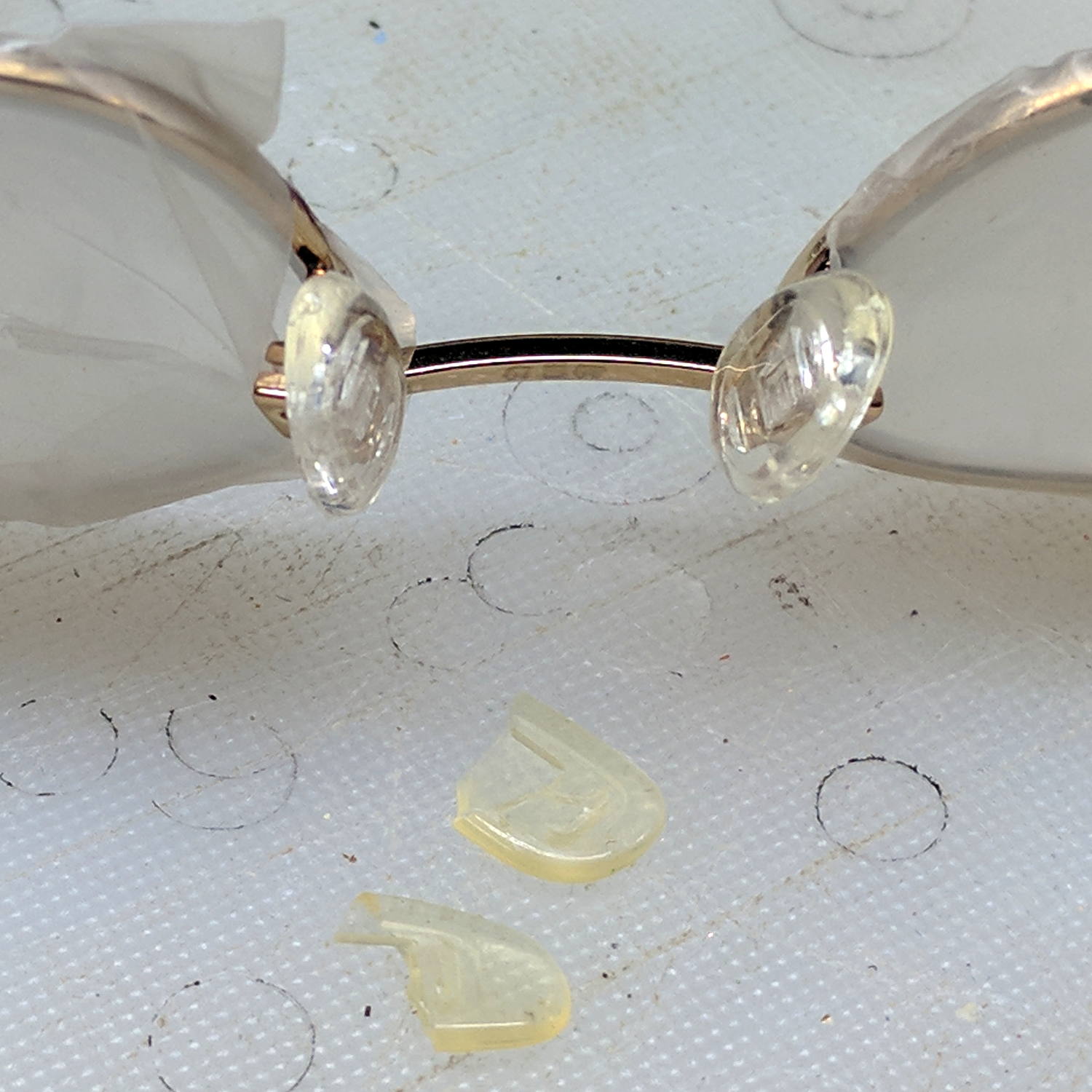 A stray nose pad appeared on the kitchen floor and, after some investigation, it corresponded with the stub in Mary’s oldest reading glasses. Some rummaging in the Bag o’ Eyeglass Stuff produced a similar pair of pads: