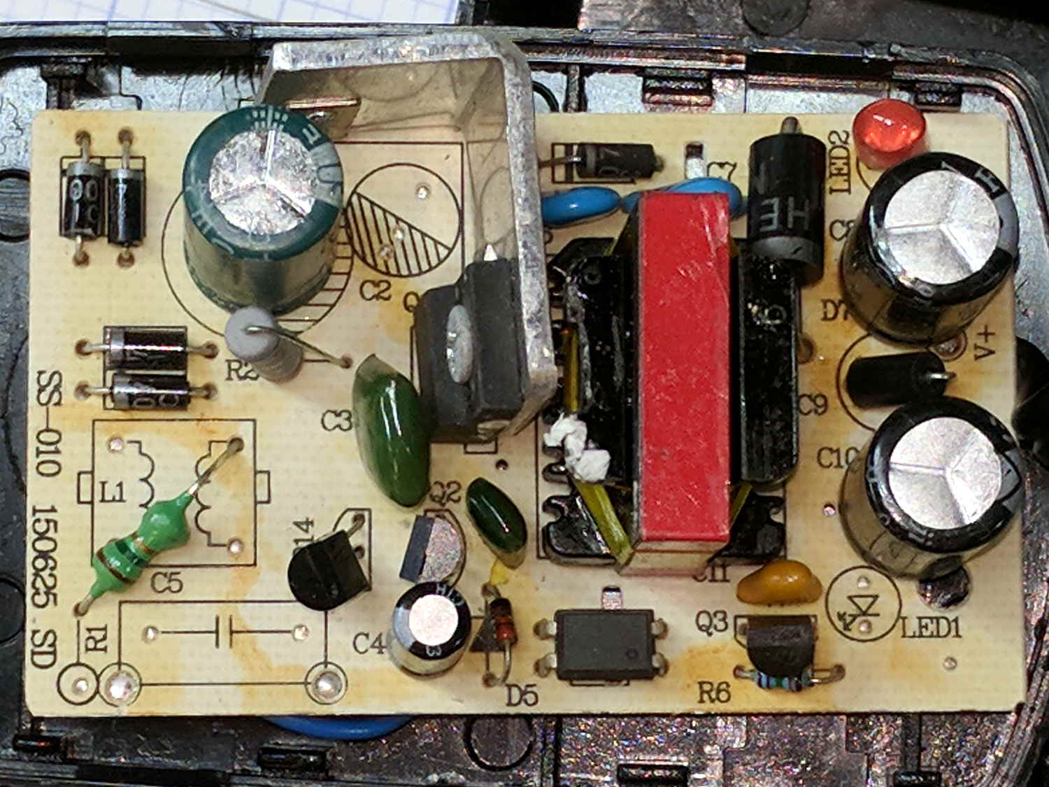 Not as many missing components as I expected, though, if the truth be told. The missing transformer common-mode choke seems odd and, AFAICT, the resistor inductor angling out from the R1 callout doesn’t connect to anything, connects directly to the AC line because C5 is missing and the pad joining them doesn’t go anywhere else it replaces the jumper (?) to the bottom-left pad and the missing parts. The red LED in the upper right isn’t visible through the black case, although it might serve as a voltage regulator.