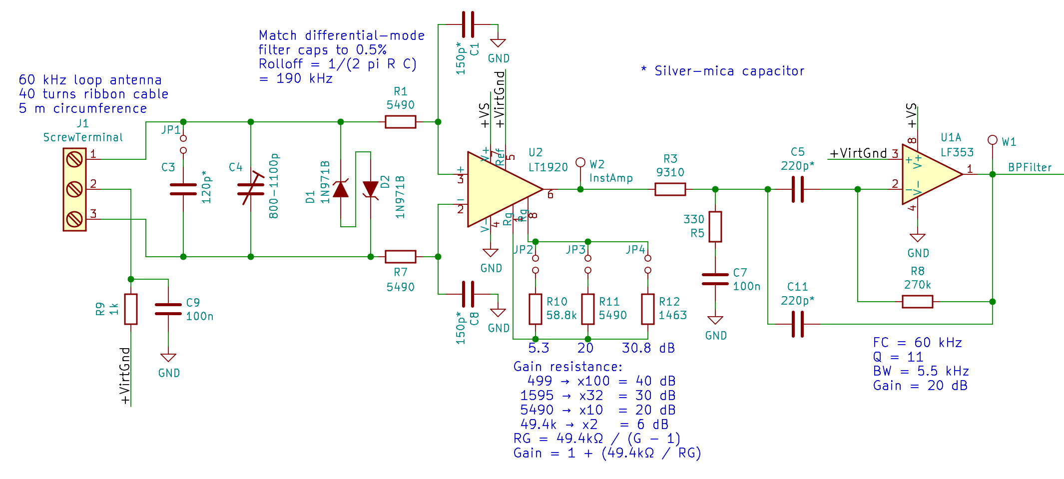 I’d inadvertently grounded the cold end of the 330 Ω input resistor in the LM353 bandpass filter, now properly tied at the Vcc/2 virtual ground to take the DC load off the LT1920 output: a 100 nF cap (27 Ω at 60 kHz) stores the bias level without messing up the filter shape.
