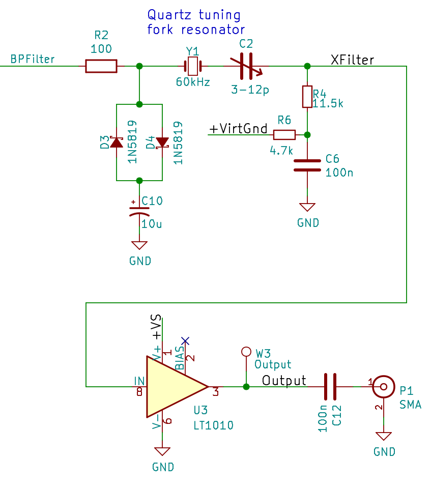 A similar cap rebiases the protected resonator at the LT1010 buffer input: