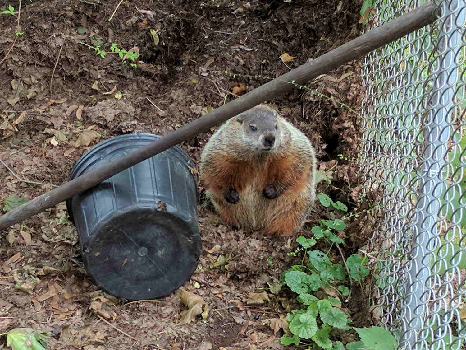 After an hour, it had vanished. We know from past experience that groundhogs can climb up-and-over the chain link fence surrounding the compost bin (it was a dog pen for the previous owners), although it knocked down the aluminum sheet and may have exited through the garden.