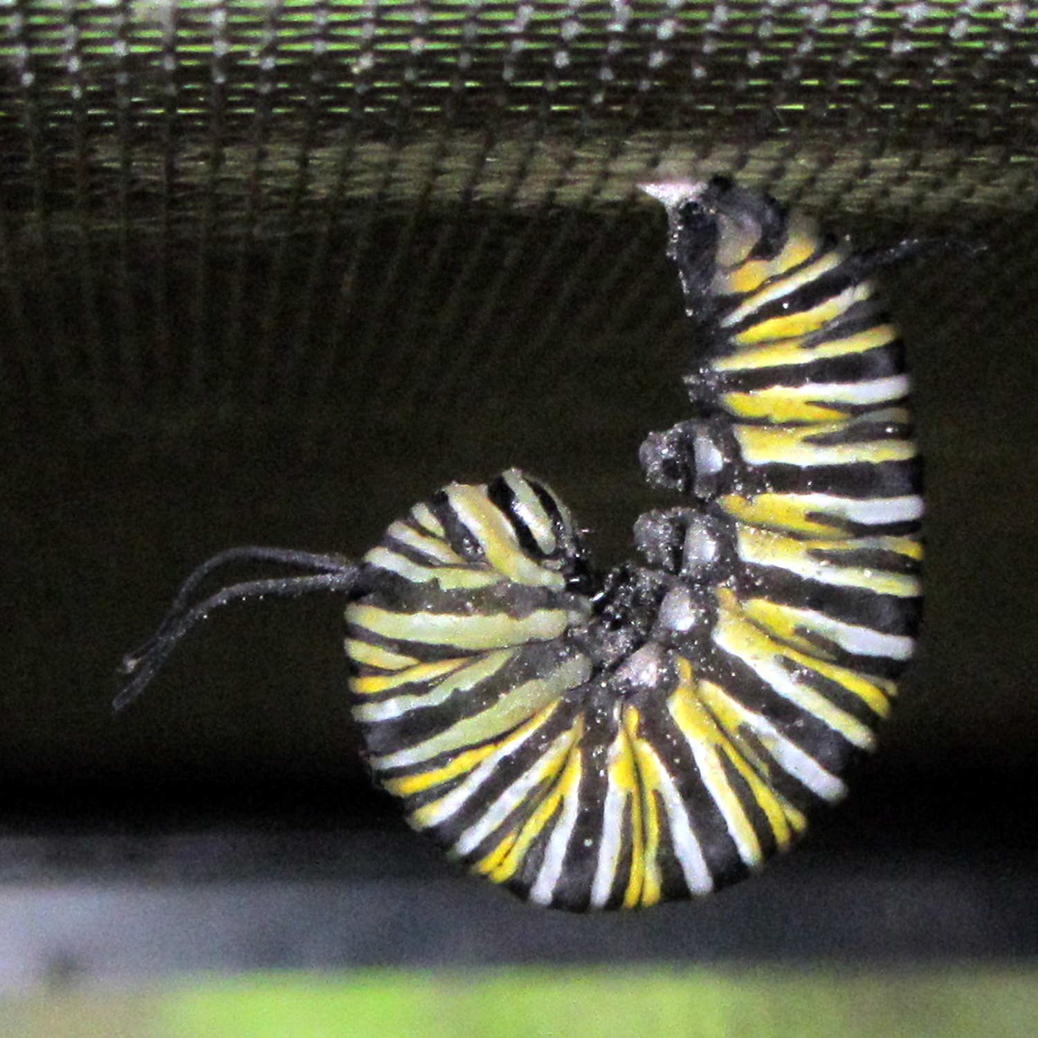 By August 15, the caterpillar was ready for the next stage in its life. At 10 in the morning it had attached itself to the screen covering the aquarium and assumed the position: