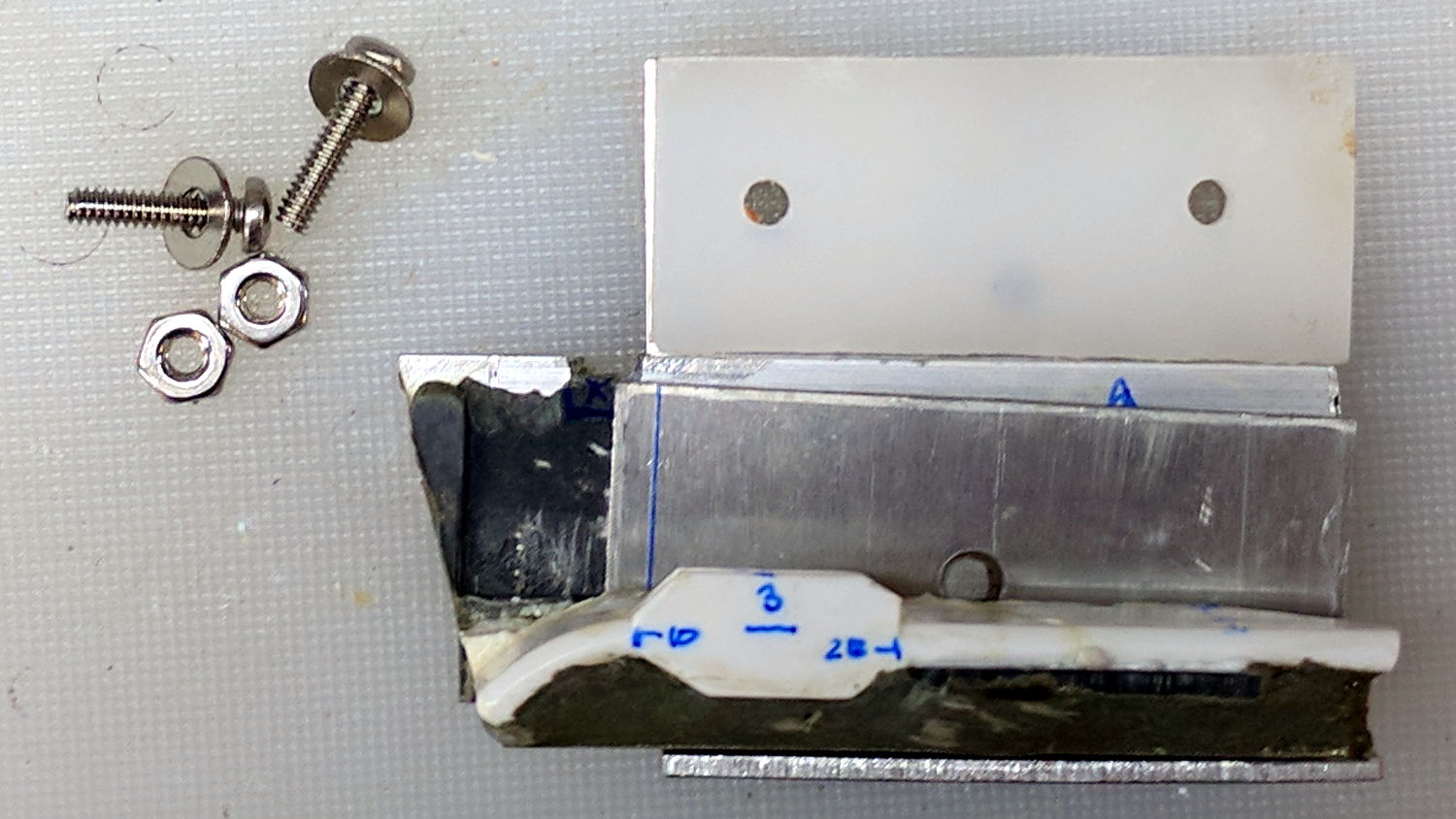 The epoxy chip and transparent plastic sheet in the first picture spaced the old aluminum bracket away from the shelf support and reduced the space beyond the new bracket enough to require drilling access holes. Fortunately, they’re hidden inside the support frame, so nobody will ever know.