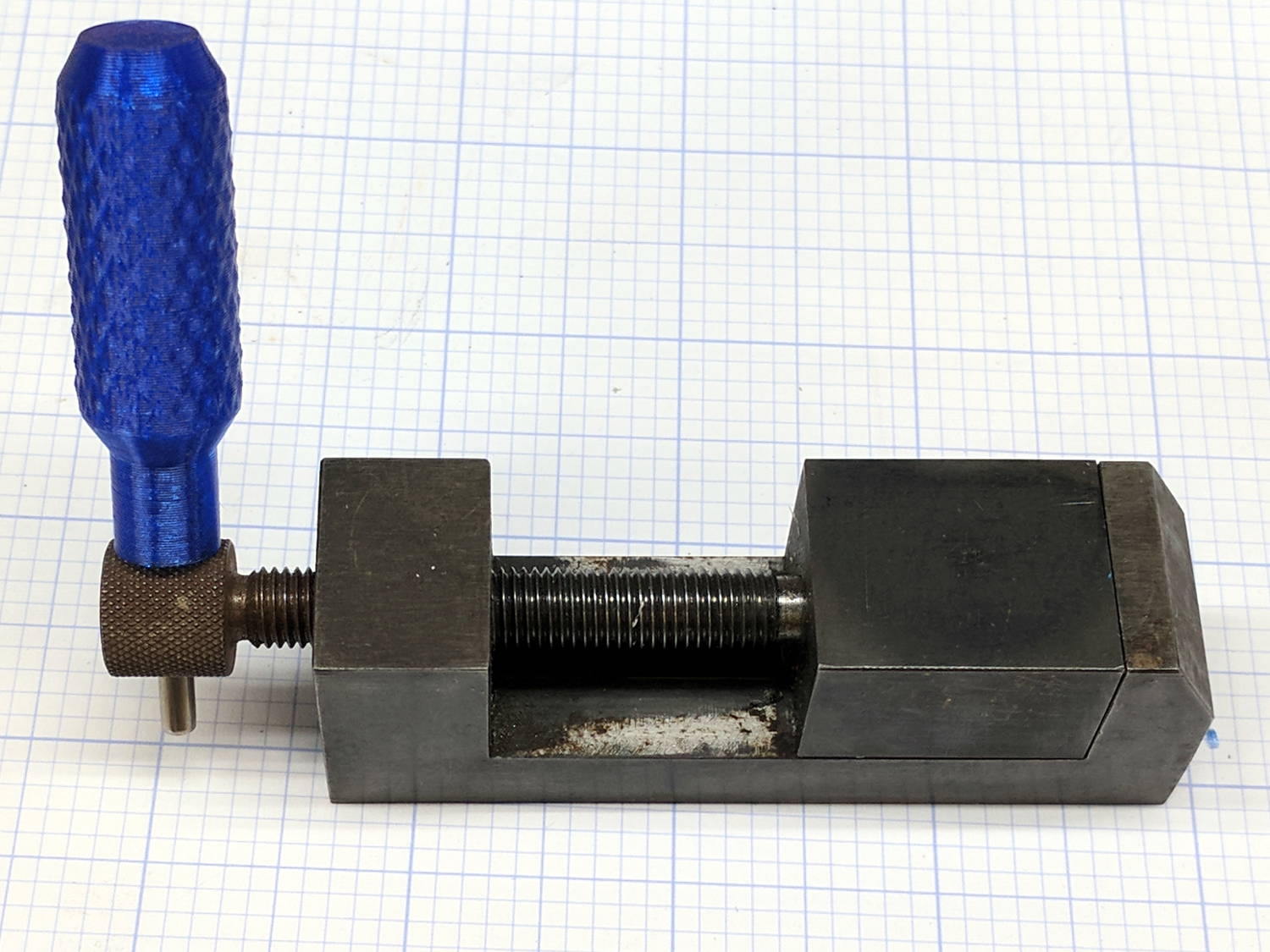 The vise knob has a hole just barely passing a length of 3.4 mm = 9/64 inch mild steel rod from the Small Box o’ Cutoffs.