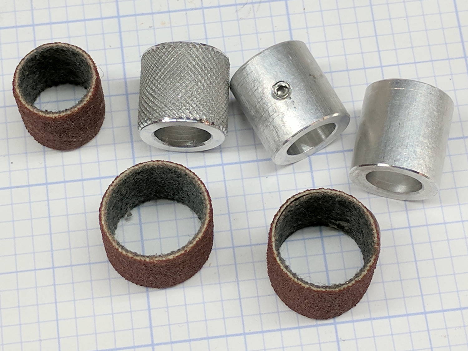 As part of recommissioning the lathe tailstock, I made some bushings to adapt Dremel sanding drums bands to an 8 mm shaft (in imitation of the grit drive wheels on the HP plotter):