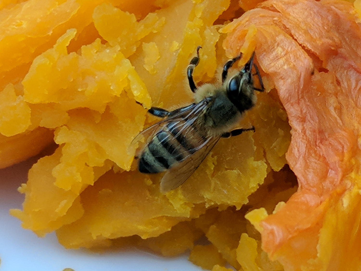 She surveyed both our plates, landed on my cooked squash, and probed into the crevices as she would to extract nectar from a flower. The weather has been dry for the last few days and we think she was looking for anything providing a bit of moisture.
