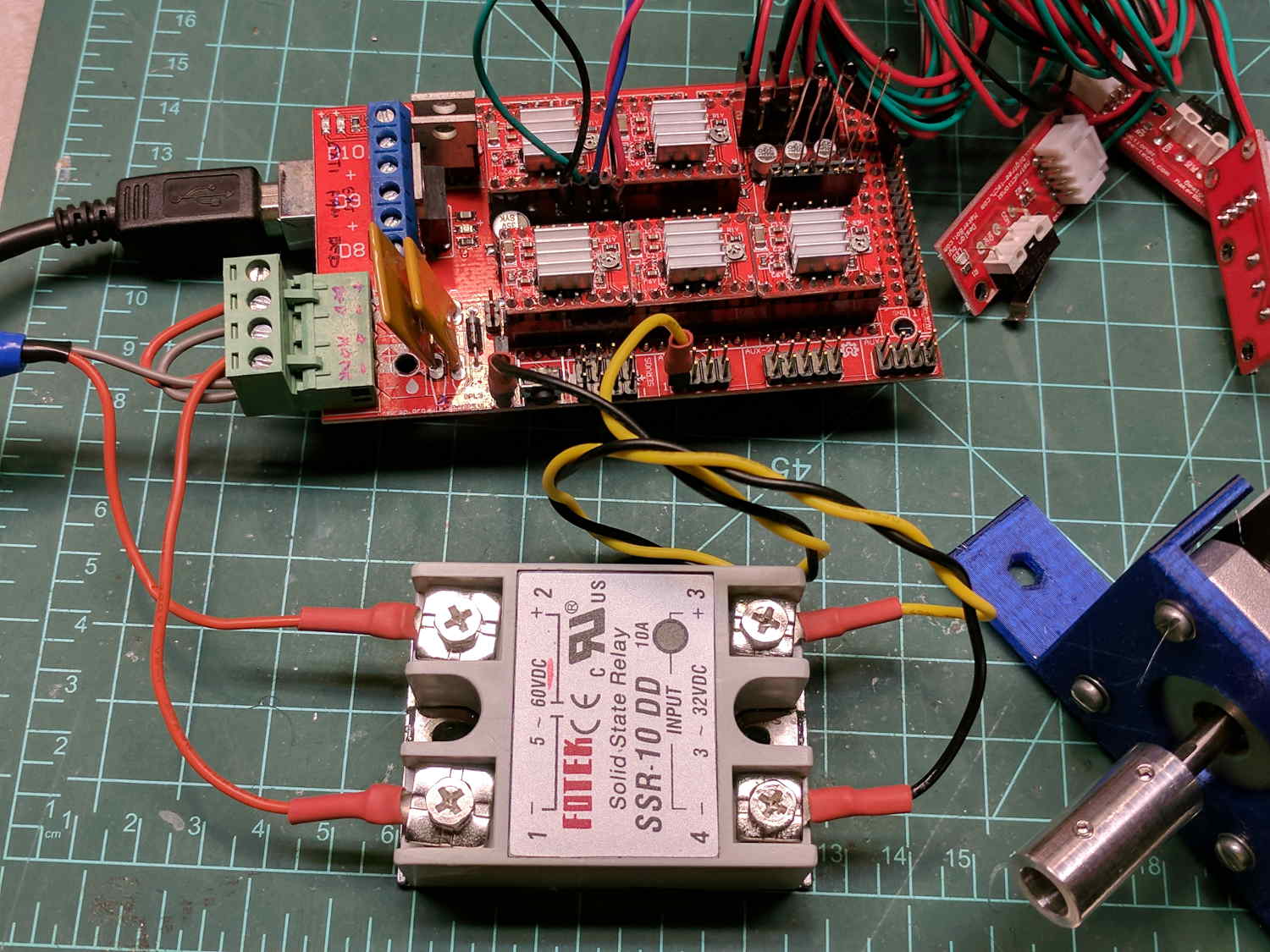 The DC (n.b., not an AC) solid state relay in the foreground switches the 20 V laptop supply brick to the RAMPS shield atop the knockoff Arduino Mega 2560, controlled by the PS_ON pin (black wire), with +5 V from a pin in the AUX header (yellow wire). The SSR includes a ballast resistor limiting the current to 12 mA, with an inconspicuous red LED behind the black dot showing when the output is turned on.