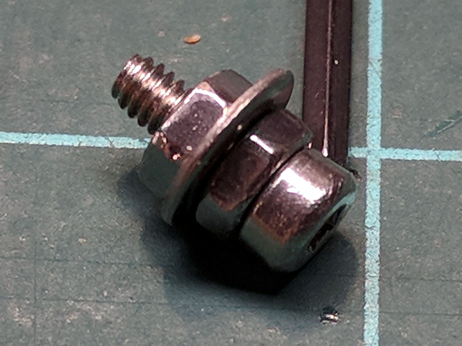 The new radio, another KG-UV3D from PowerWerx, has marginally different spacing around the screw attaching the plug cover preventing the previous screw from fitting, so I kludged up a screw from a 2 mm socket-head screw, a 2.5 mm (yes) washer, and a pair of 2 mm nuts: