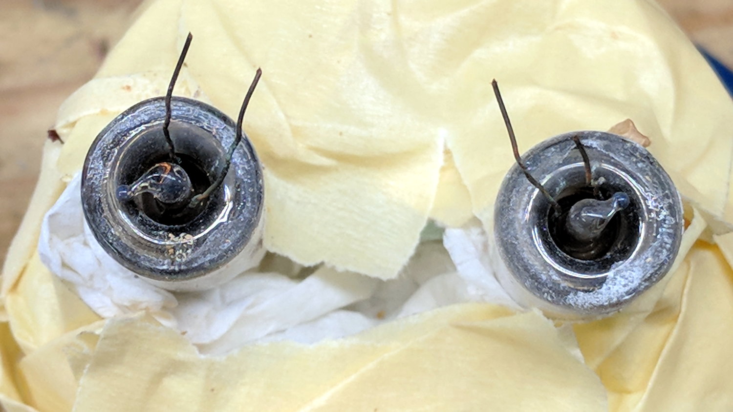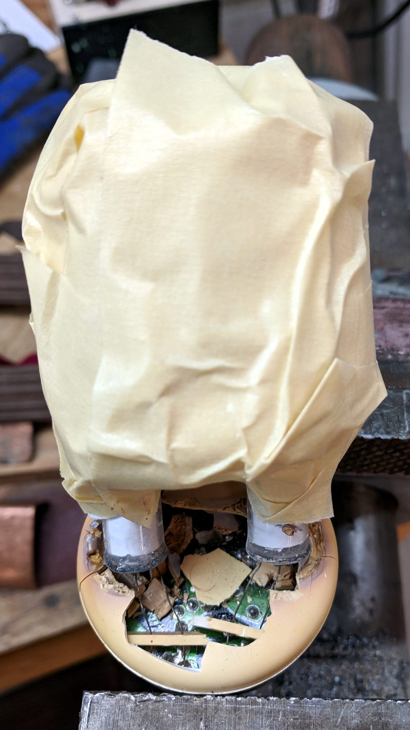 The terminal ends fit loosely in the crumbling base at the start of this operation, leaving the tube wobbling above the base. The plastic cracked as I wrapped the tube, so, for lack of anything smarter, I applied a pin punch to break away the rest of the upper base.